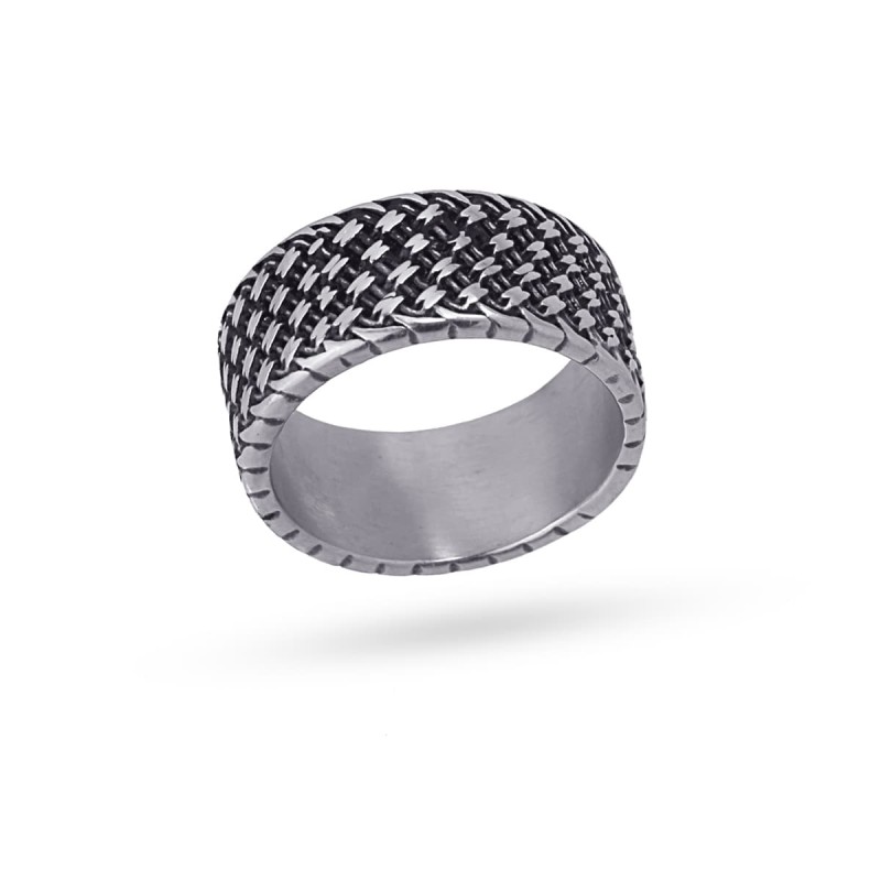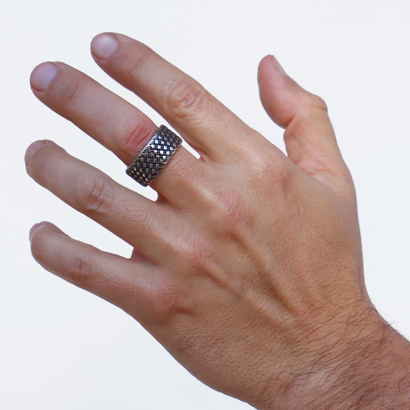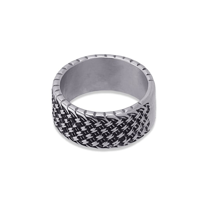 Anillo para hombre de acero quirúrgico con diseño texturizado. Diseño original disponible en color oro o plata combinado con negro. Mide 11 mm de ancho. No produce alergia, se puede mojar y no oxida.
