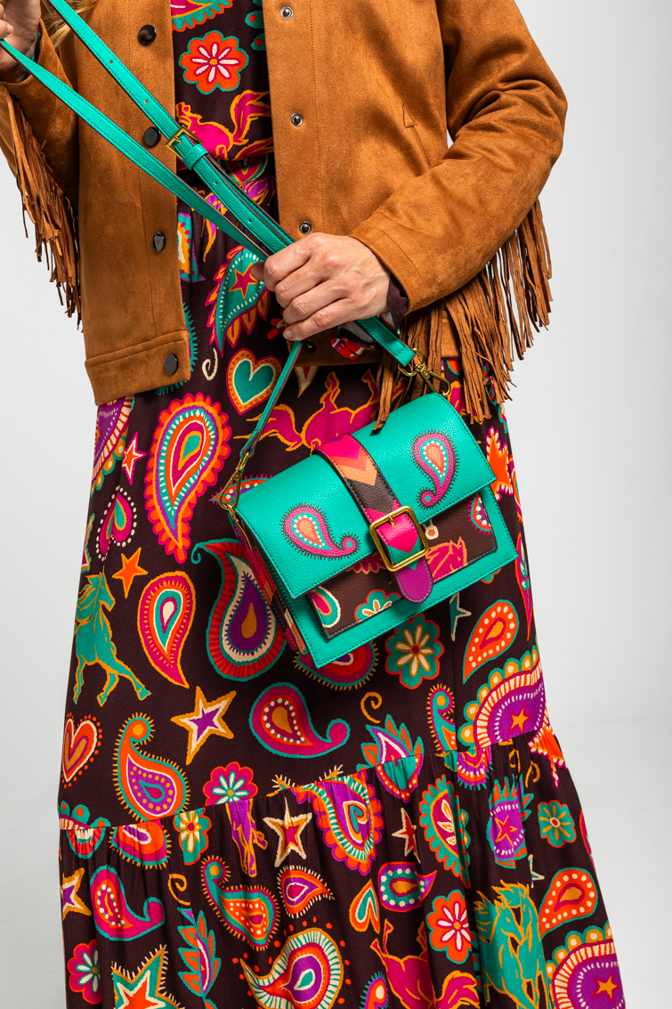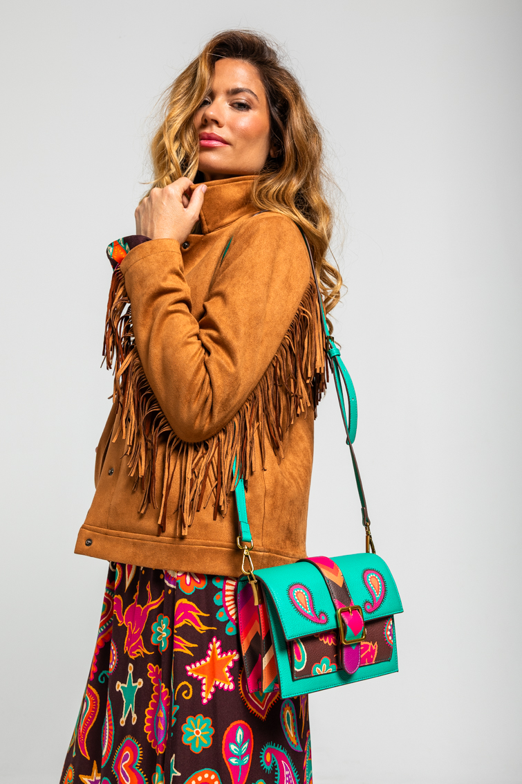 Freedoom: no hay mayor sensación de libertad que galopar a contracorriente. – Bandolera Hebilla: Bolso pequeño bandolera con asa larga, solapa con cierre magnético oculto varios compartimentos y correa de Lolina de quita y pon con mosquetones. Detalle de ilustración posicional bordada – Exterior: 100% Polipiel. Interior: 100% Poliéster. Fornituras: Metal. – No lavar a máquina ni usar secadora. Limpiar con un paño húmedo y jabón neutro, frotar si hay alguna mancha y luego retirar el exceso de humedad con otro paño seco. – 20 x 16 x 6 cm Las medidas de los bolsos pueden presentar pequeñas variaciones debido al proceso de producción de hasta 2 cm. – Lolina ha realizado un gran esfuerzo para mostrar los colores de las prendas de la forma más cercana a la realidad posible. No obstante, queremos que tengas en cuenta que el color de las prendas que aparecen en pantalla puede estar sujeto a variaciones dependiendo de la calidad de tu ordenador o smartphone.