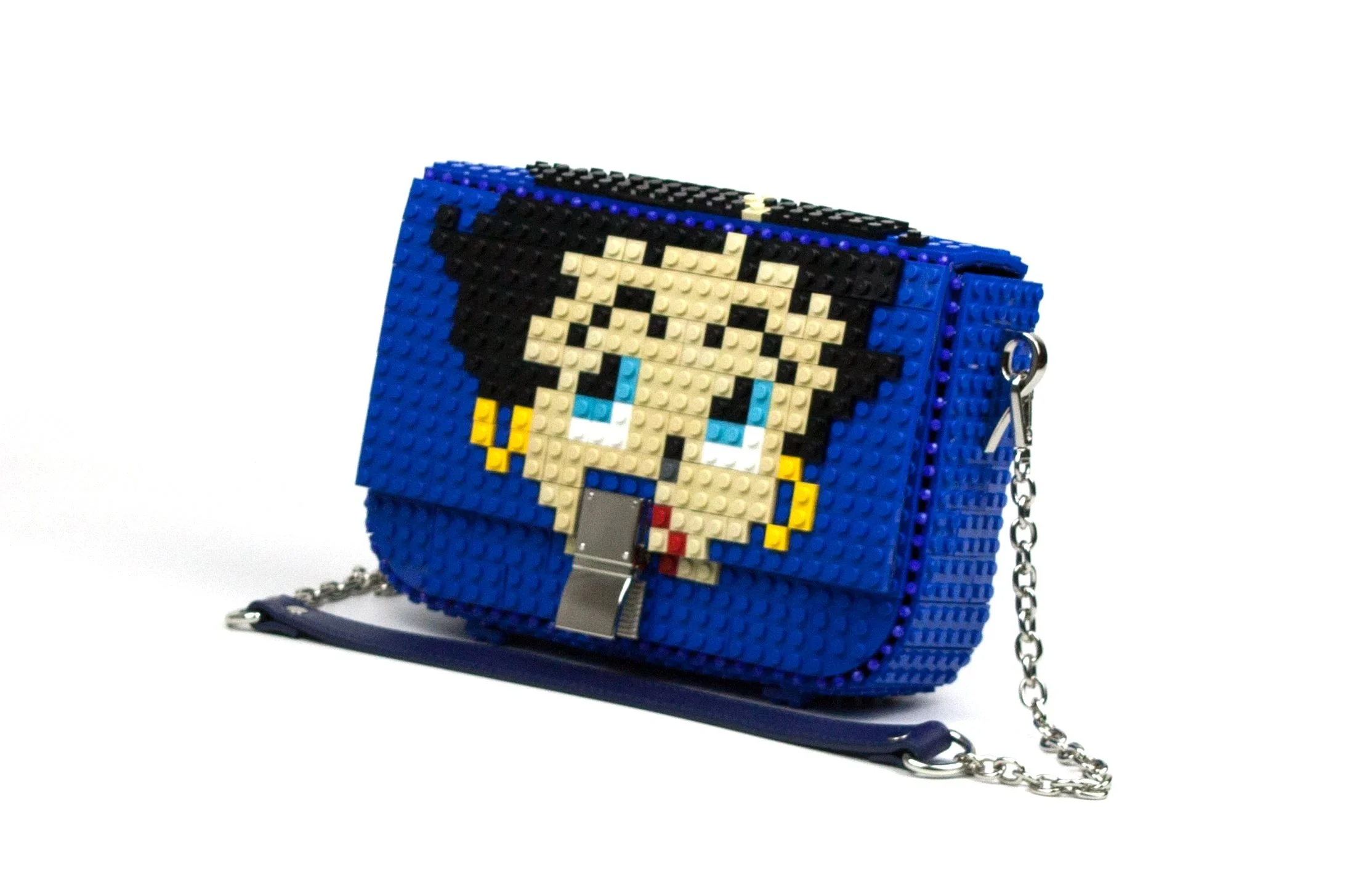 Bag with Clip Clasp, in&out leather/metal strap in blue color customizing the design as the photo.We will ship you the bag with the design already assembled. The design blocks are in&out, so you can use them for this customization or any other, change your Bag&Block whenever you want and adapt it any time to your wish.Dimensions 28cm x 17cm x 8cm. Weight 460gr + 130-160gr leather & metal chain. 266 ABS Blocks Hand Assembled + In&Out top blocks. Includes Cotton Dust Bag, inside pocket and In&Out 120cm length Leather & Metal Chain.Main Composition: ABS blocks, Glass beads, leather strap and Metallic accessories. Lining Composition: 100%Polyester Satin. Top design made in Zamora (Spain). Bag base assembled in Tamil Nadu (India).Please click here to see inside and outside detailed photos from the bag.We can send you the strap length you wish according you body and how you like to wear your handbags, please check on this link our suggested lengths and add to the cart the length you wish, if you do not choose any specific length we will send you the standard length for this bag, this is 120 cm length.If you wish you can add an extra strap to your cart in this link, this way you can have a long and a short strap to change whenever you want.Add additional block packs to your order so you can customize your Bag&Block endless times, each design on this website includes the list of blocks needed and you can use our blocks or any standard brand.——————————————————————————————————————————Bolso con cierre con forma de clip, correa de piel y cadena metálica de quita y pon en color azul con el diseño de la foto.El bolso se enviará con el dibujo ya montado para que lo puedas disfrutar desde el minuto cero, piensa que todos los diseños son de quita y pon, o sea que puedes cambiar el bolso siempre que quieras y adaptarlo a los colores o el estilo que lleves.Dimensiones 28cm x 17cm x 8cm. Peso 460gr+130-160gr la correa de cuero y cadena metálica. Formado por 266 bloques de ABS ensamblados a mano. Incluye funda guardapolvo de algodón, bolsillo interior, correa de piel y cadena metálica de quita y pon de 120 cm de longitud.Composición exterior: bloques de ABS, abalorios de cristal, correa de cuero y accesorios metálicos. Composición del forro interior: Raso 100% Poliéster. El dibujo de quita y pon se realiza en Zamora (España) y la base del bolso se realiza en Tamil Nadu (India).Pulse aquí para ver fotografías detalladas del interior y exterior del bolso.Te podemos enviar el bolso con el largo de asa que desees, por favor mira en este enlace las medidas que recomendamos e introduce en el carrito la medida de asa que desees. Si no eliges un largo especial en este link te enviaremos el asa de 120cm.Si quieres un asa extra añádela al carrito en este link y te enviaremos dos asas, así puedes ponerle asa corta o asa larga cuando quieras a tu bolso.Puedes añadir más paquetes de bloques en tu pedido en este enlace, así podrás customizar tu bolso siempre que quieras, en cada diseño especificamos los paquetes de bloques necesarios, echa un vistazo a otros diseños que te gusten y podrás tener ambos en un solo bolso. Bag&Block es compatible con las piezas de otras marcas estándar de bloques de construcción.
