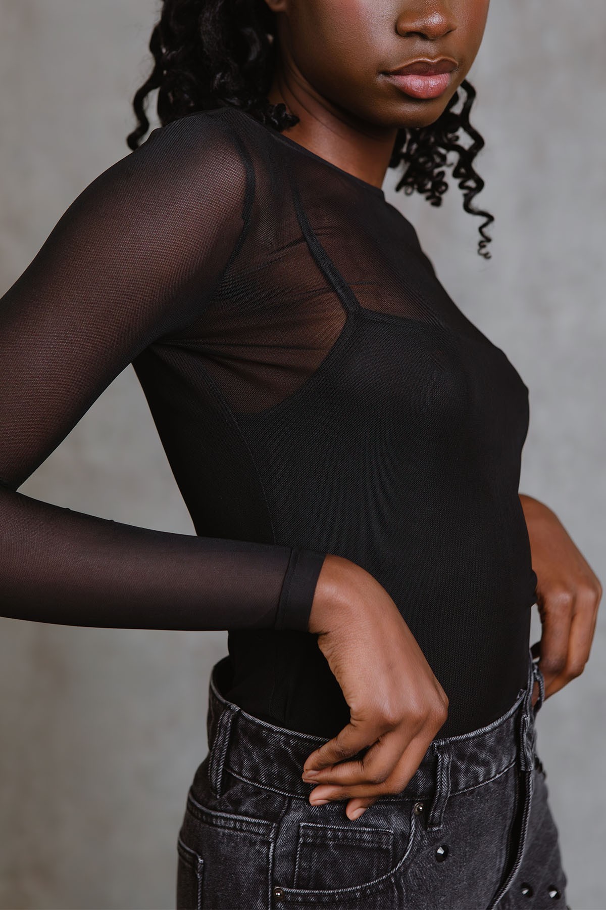 Camiseta de cuello redondo y manga larga. Semitransparente de tejido elástico. Forro interior elástico de tirantes.