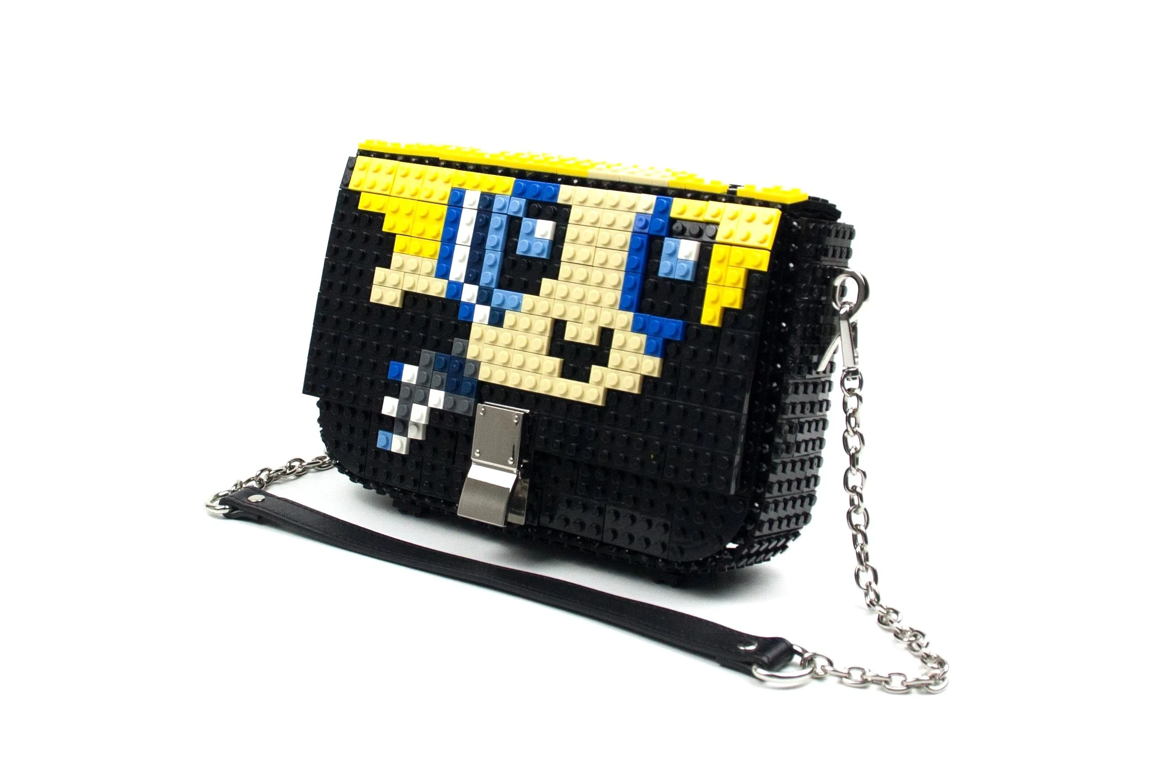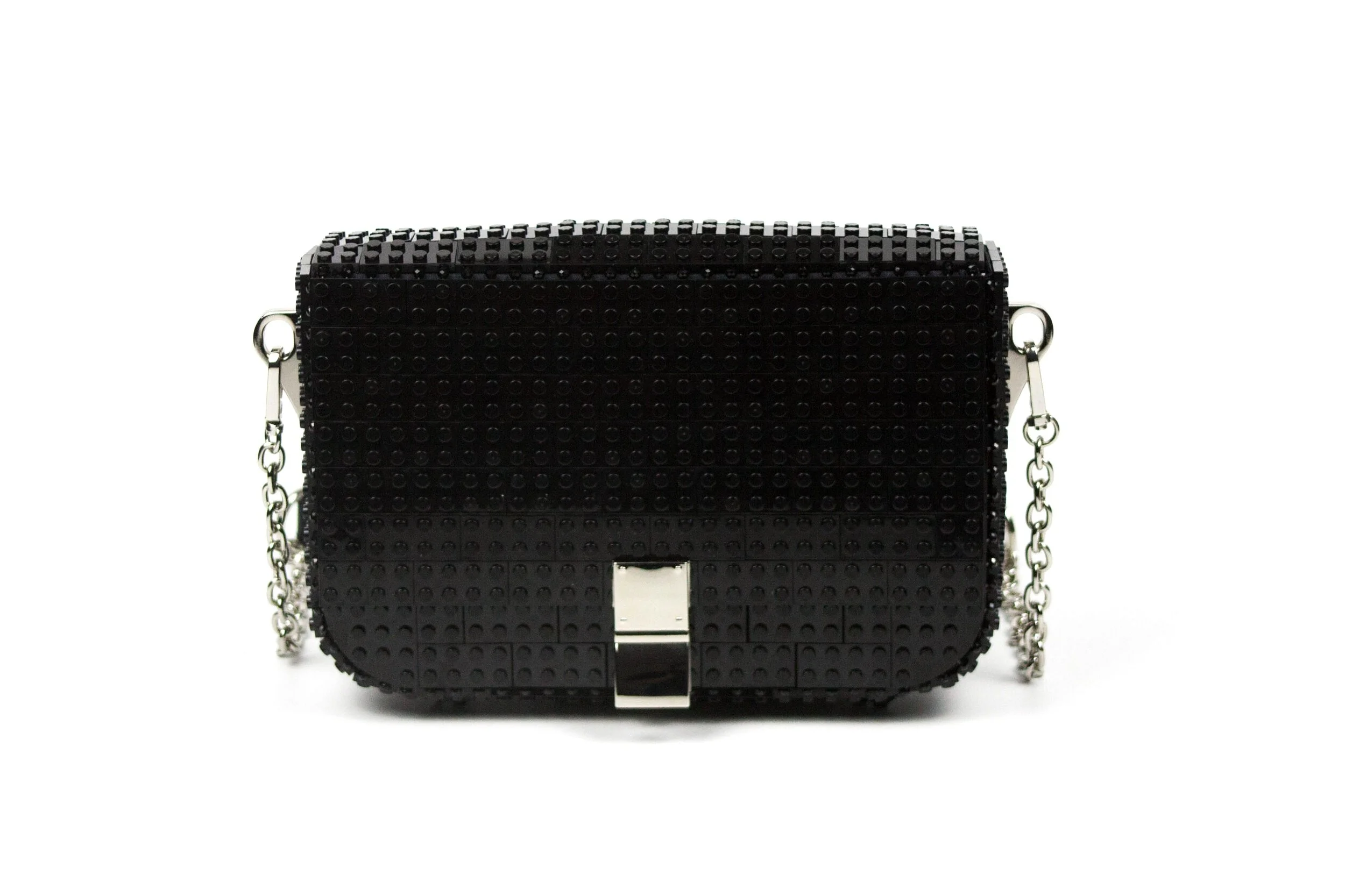 Bag with Clip Clasp, in&out leather/metal strap in black color customizing the design as the photo.We will ship you the bag with the design already assembled. The design blocks are in&out, so you can use them for this customization or any other, change your Bag&Block whenever you want and adapt it any time to your wish.Dimensions 28cm x 17cm x 8cm. Weight 460gr + 130-160gr leather & metal chain. 266 ABS Blocks Hand Assembled + In&Out top blocks. Includes Cotton Dust Bag, inside pocket and In&Out 120cm length Leather & Metal Chain.Main Composition: ABS blocks, Glass beads, leather strap and Metallic accessories. Lining Composition: 100%Polyester Satin. Top design made in Zamora (Spain). Bag base assembled in Tamil Nadu (India).Please click here to see inside and outside detailed photos from the bag.We can send you the strap length you wish according you body and how you like to wear your handbags, please check on this link our suggested lengths and add to the cart the length you wish, if you do not choose any specific length we will send you the standard length for this bag, this is 120 cm length.If you wish you can add an extra strap to your cart in this link, this way you can have a long and a short strap to change whenever you want.Add additional block packs to your order so you can customize your Bag&Block endless times, each design on this website includes the list of blocks needed and you can use our blocks or any standard brand.——————————————————————————————————————————Bolso con cierre con forma de clip, correa de piel y cadena metálica de quita y pon en color negro con el diseño de la foto.El bolso se enviará con el dibujo ya montado para que lo puedas disfrutar desde el minuto cero, piensa que todos los diseños son de quita y pon, o sea que puedes cambiar el bolso siempre que quieras y adaptarlo a los colores o el estilo que lleves.Dimensiones 28cm x 17cm x 8cm. Peso 460gr+130-160gr la correa de cuero y cadena metálica. Formado por 266 bloques de ABS ensamblados a mano. Incluye funda guardapolvo de algodón, bolsillo interior, correa de piel y cadena metálica de quita y pon de 120 cm de longitud.Composición exterior: bloques de ABS, abalorios de cristal, correa de cuero y accesorios metálicos. Composición del forro interior: Raso 100% Poliéster. El dibujo de quita y pon se realiza en Zamora (España) y la base del bolso se realiza en Tamil Nadu (India).Pulse aquí para ver fotografías detalladas del interior y exterior del bolso.Te podemos enviar el bolso con el largo de asa que desees, por favor mira en este enlace las medidas que recomendamos e introduce en el carrito la medida de asa que desees. Si no eliges un largo especial en este link te enviaremos el asa de 120cm.Si quieres un asa extra añádela al carrito en este link y te enviaremos dos asas, así puedes ponerle asa corta o asa larga cuando quieras a tu bolso.Puedes añadir más paquetes de bloques en tu pedido en este enlace, así podrás customizar tu bolso siempre que quieras, en cada diseño especificamos los paquetes de bloques necesarios, echa un vistazo a otros diseños que te gusten y podrás tener ambos en un solo bolso. Bag&Block es compatible con las piezas de otras marcas estándar de bloques de construcción.