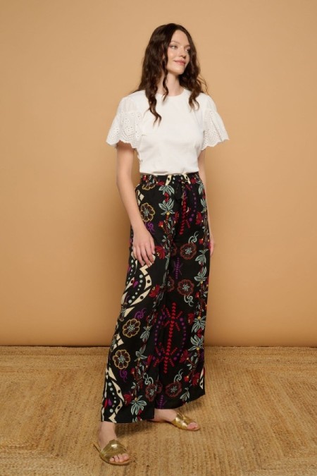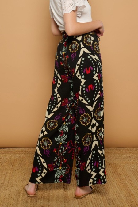 Pantalón de tejido fluido de tiro medio y pernera ancha. Estampado boho. Cintura elástica ajustable con lazada. Bolsillos laterales.