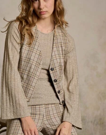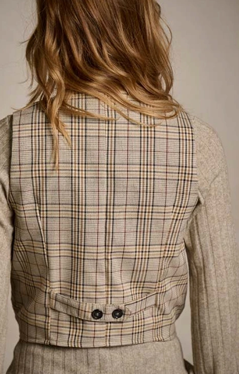 Chaleco de la marca Maggie Sweet estampado de cuadros en tonos beige, a juego con el pantalón Tina. Composición: 100% PL Hecho en España