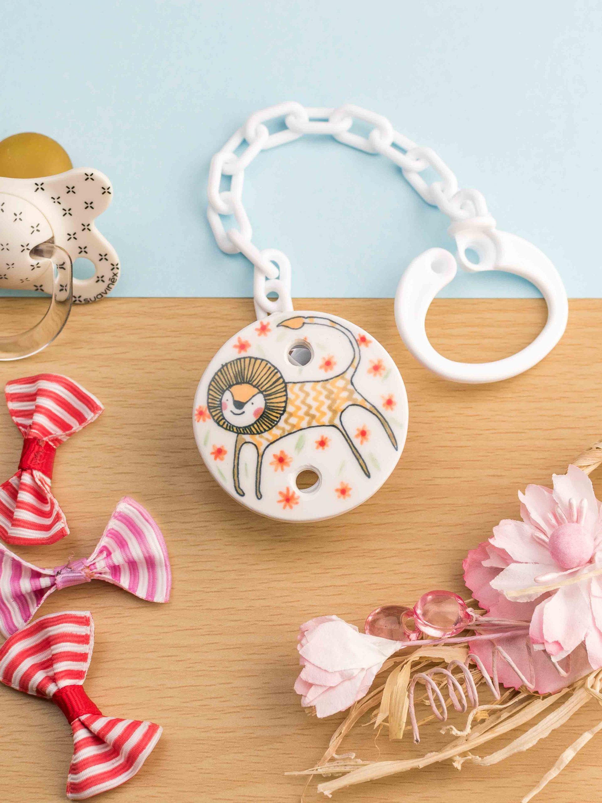 Este chupetero es para el rey o la reina de la casa. Si quieres se puede combinar con un babero a juego 🙂