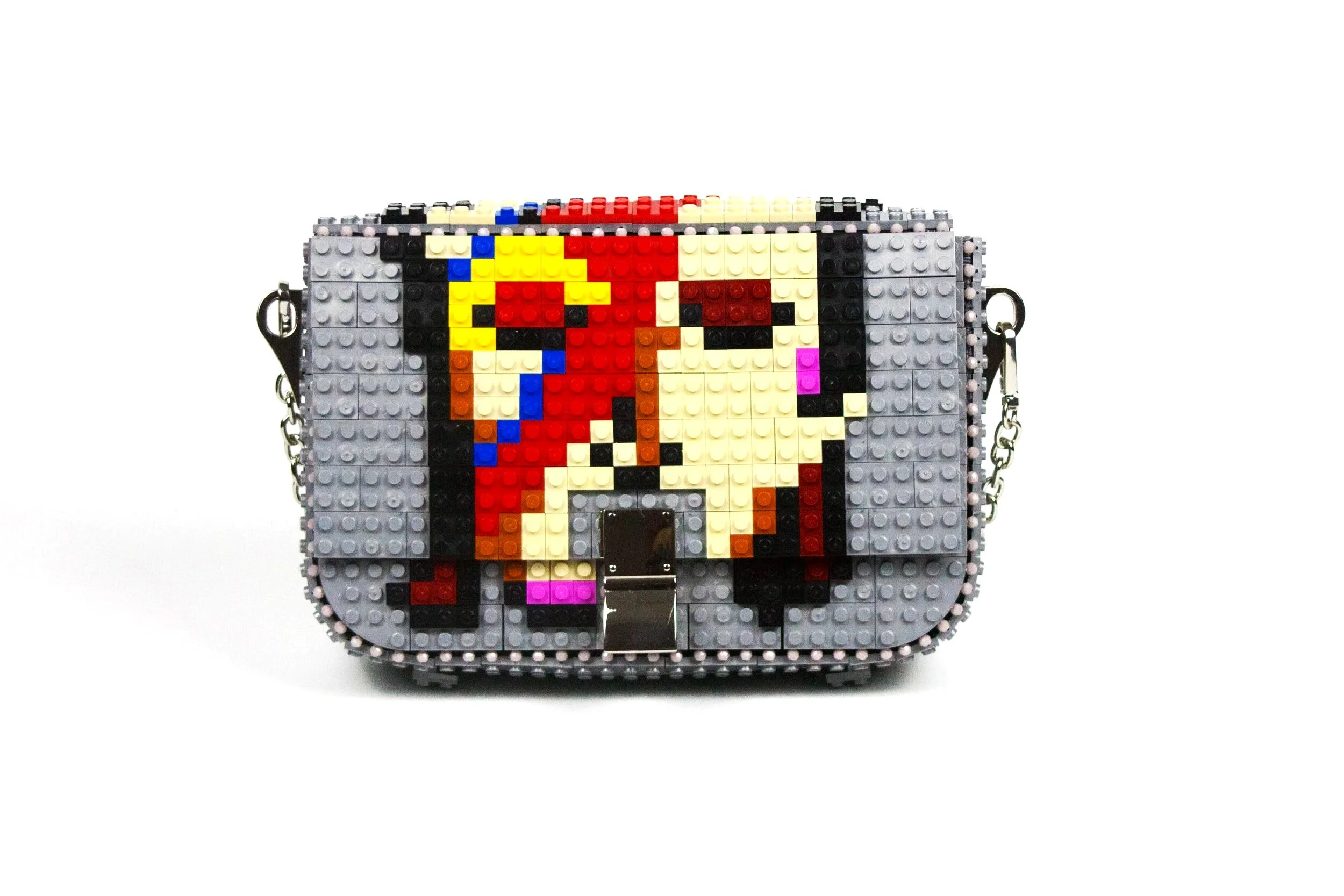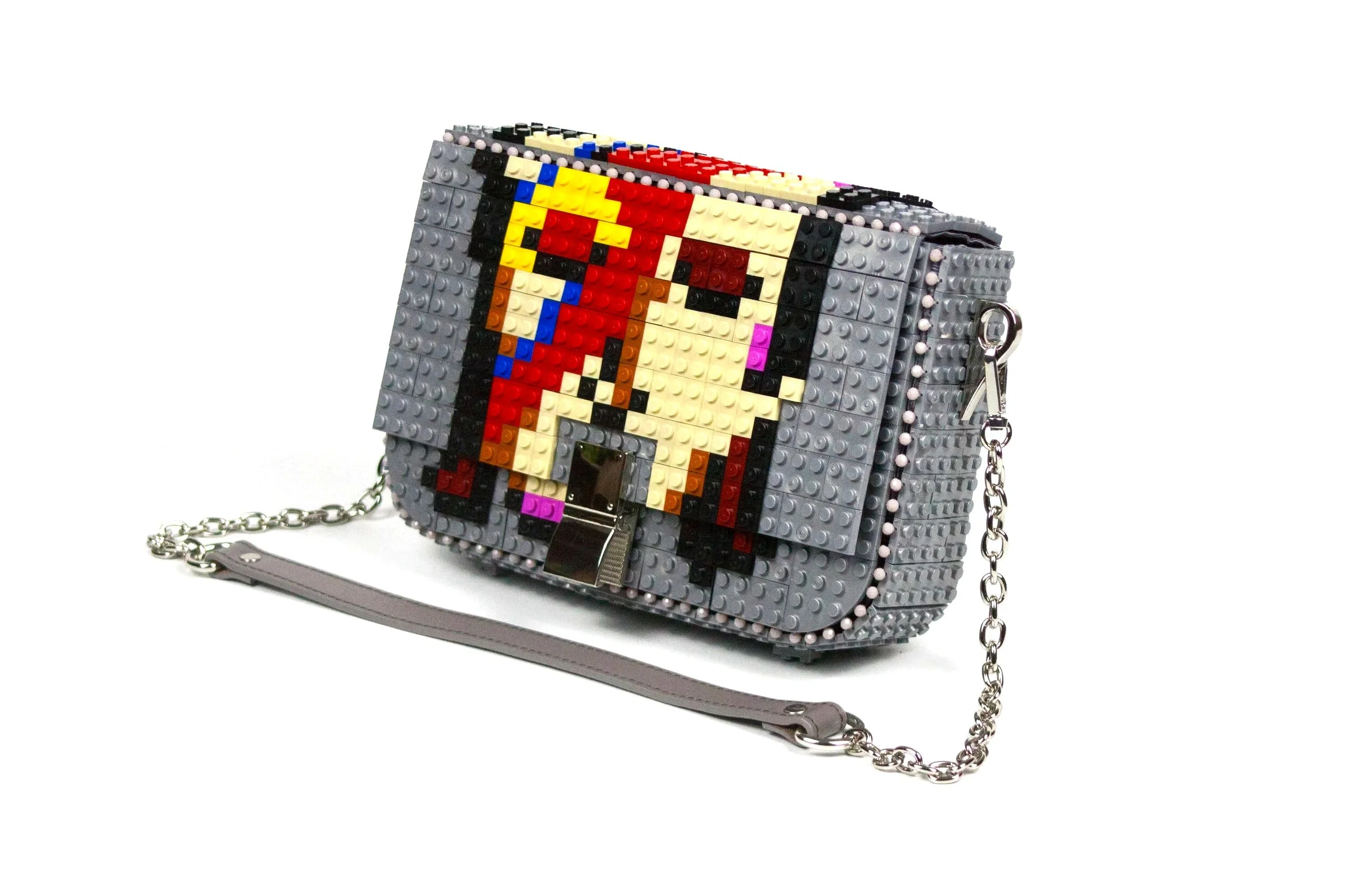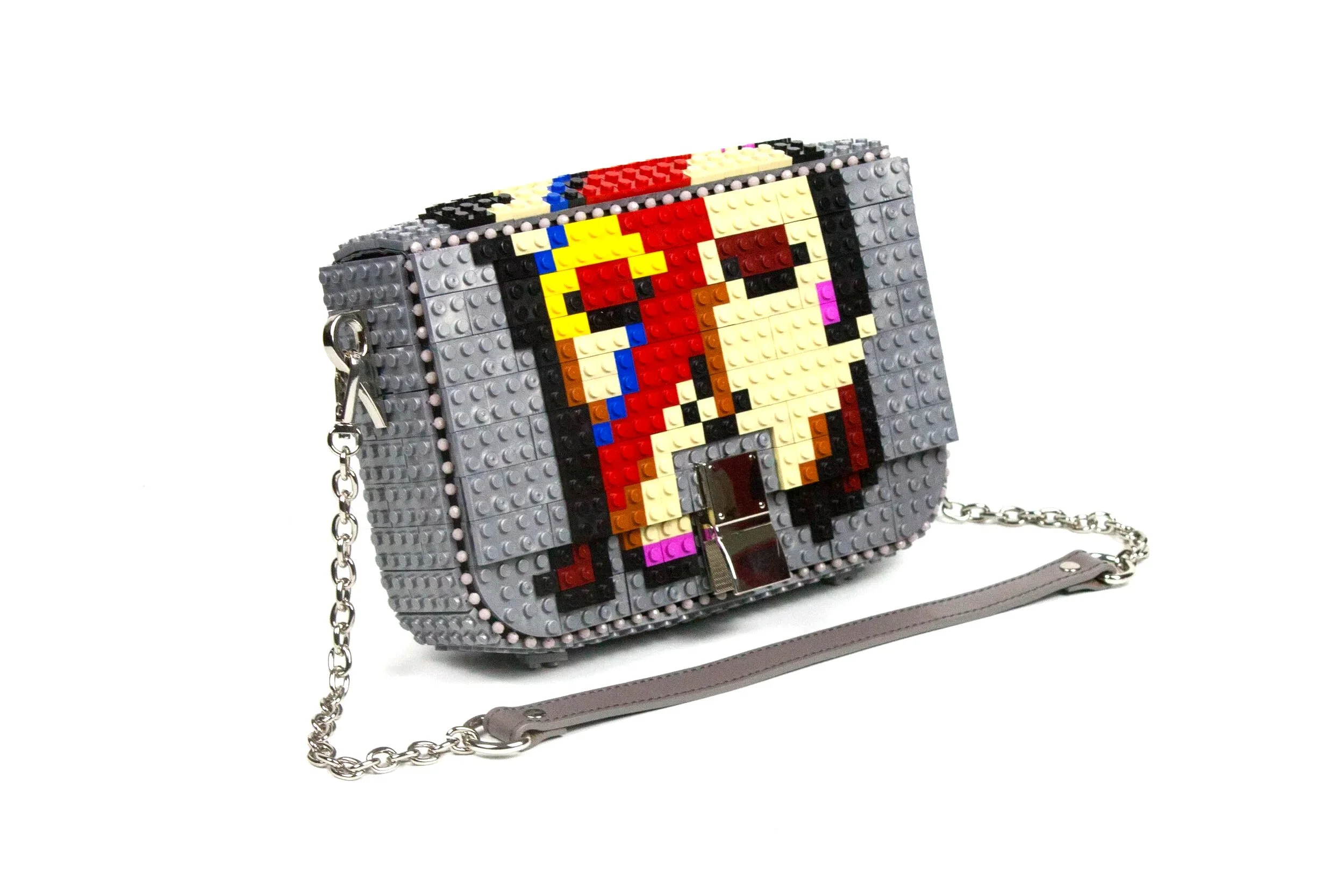 Bag with Clip Clasp, in&out leather/metal strap in silver color customizing the design as the photo.We will ship you the bag with the design already assembled. The design blocks are in&out, so you can use them for this customization or any other, change your Bag&Block whenever you want and adapt it any time to your wish.Dimensions 28cm x 17cm x 8cm. Weight 460gr + 130-160gr leather & metal chain. 266 ABS Blocks Hand Assembled + In&Out top blocks. Includes Cotton Dust Bag, inside pocket and In&Out 120cm length Leather & Metal Chain.Main Composition: ABS blocks, Glass beads, leather strap and Metallic accessories. Lining Composition: 100%Polyester Satin. Top design made in Zamora (Spain). Bag base assembled in Tamil Nadu (India).Please click here to see inside and outside detailed photos from the bag.We can send you the strap length you wish according you body and how you like to wear your handbags, please check on this link our suggested lengths and add to the cart the length you wish, if you do not choose any specific length we will send you the standard length for this bag, this is 120 cm length.If you wish you can add an extra strap to your cart in this link, this way you can have a long and a short strap to change whenever you want.Add additional block packs to your order so you can customize your Bag&Block endless times, each design on this website includes the list of blocks needed and you can use our blocks or any standard brand.——————————————————————————————————————————Bolso con cierre con forma de clip, correa de piel y cadena metálica de quita y pon en color plata con el diseño de la foto.El bolso se enviará con el dibujo ya montado para que lo puedas disfrutar desde el minuto cero, piensa que todos los diseños son de quita y pon, o sea que puedes cambiar el bolso siempre que quieras y adaptarlo a los colores o el estilo que lleves.Dimensiones 28cm x 17cm x 8cm. Peso 460gr+130-160gr la correa de cuero y cadena metálica. Formado por 266 bloques de ABS ensamblados a mano. Incluye funda guardapolvo de algodón, bolsillo interior, correa de piel y cadena metálica de quita y pon de 120 cm de longitud.Composición exterior: bloques de ABS, abalorios de cristal, correa de cuero y accesorios metálicos. Composición del forro interior: Raso 100% Poliéster. El dibujo de quita y pon se realiza en Zamora (España) y la base del bolso se realiza en Tamil Nadu (India).Pulse aquí para ver fotografías detalladas del interior y exterior del bolso.Te podemos enviar el bolso con el largo de asa que desees, por favor mira en este enlace las medidas que recomendamos e introduce en el carrito la medida de asa que desees. Si no eliges un largo especial en este link te enviaremos el asa de 120cm.Si quieres un asa extra añádela al carrito en este link y te enviaremos dos asas, así puedes ponerle asa corta o asa larga cuando quieras a tu bolso.Puedes añadir más paquetes de bloques en tu pedido en este enlace, así podrás customizar tu bolso siempre que quieras, en cada diseño especificamos los paquetes de bloques necesarios, echa un vistazo a otros diseños que te gusten y podrás tener ambos en un solo bolso. Bag&Block es compatible con las piezas de otras marcas estándar de bloques de construcción.