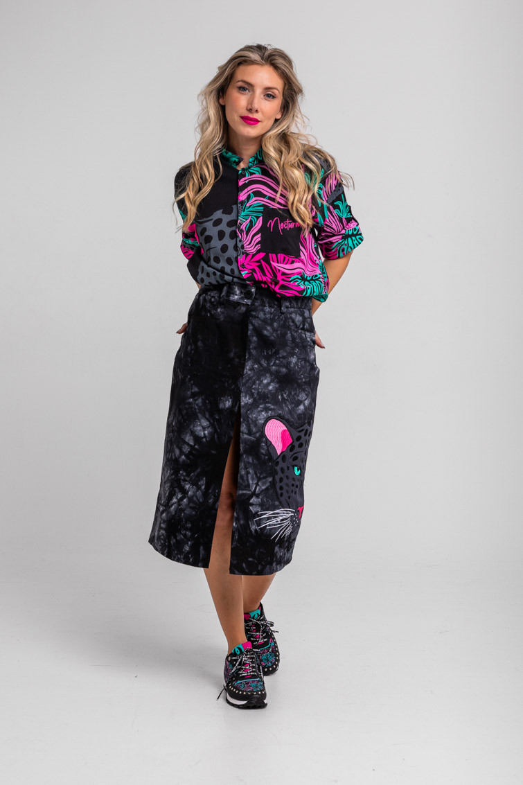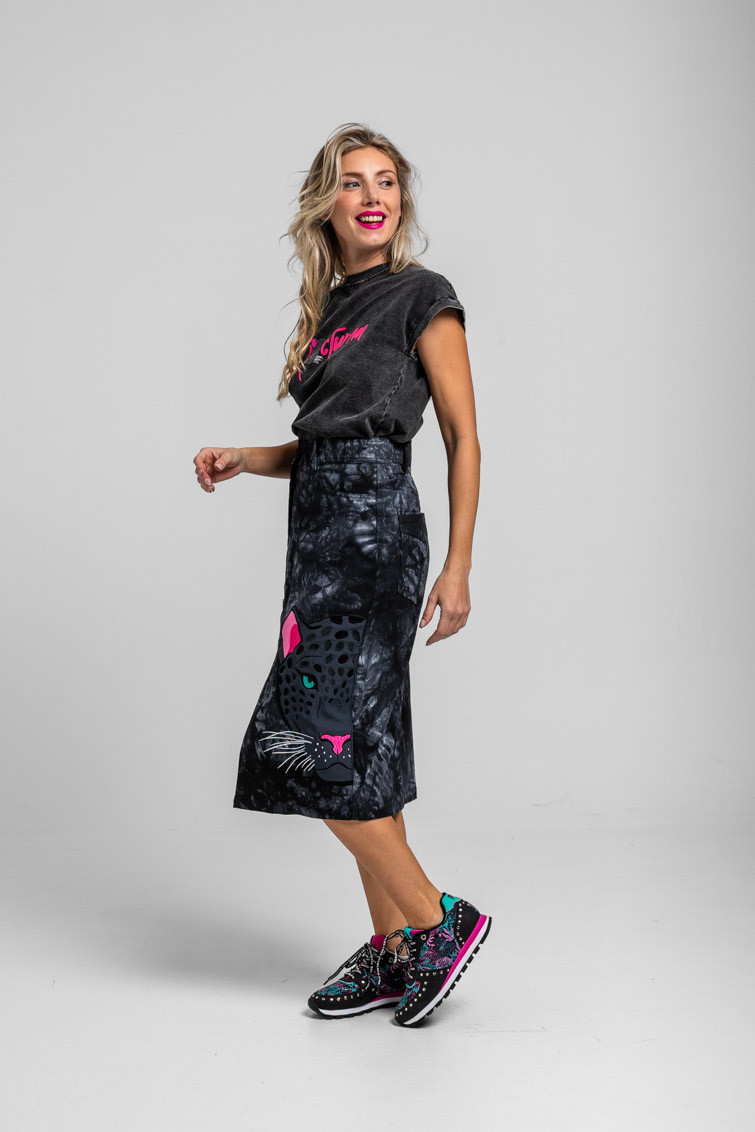 Nocturna: y siembre al acecho intentando cazar al tiempo – Falda Midi Jeans tie dye con pantera: Falda midi con bolsillos y raja central delantera. Modelo de talle alto con cierre de cremallera con botón. – 100% Algodón. – Lavar a máquina en agua fría. No usar blanqueador. No usar secadora. Secar colgado a la sombra. Planchado a temperatura baja, por debajo de 100 ºC. Planchar del revés. No dejar la plancha parada sobre la prenda. Lavar con colores similares. – TALLA XS: Medidas de cintura 34 cm, cadera 46 cm y largo 74,5 cm. TALLA S: Medidas de cintura 36 cm, cadera 48 cm y largo 76 cm. TALLA M: Medidas de cintura 38 cm, cadera 50 cm y largo 77,5 cm. TALLA L: Medidas de cintura 40 cm, cadera 52 cm y largo 79 cm. TALLA XL: Medidas de cintura 42 cm, cadera 54 cm y largo 80,5 cm. – Las medidas de las prendas pueden presentar pequeñas variaciones debido al proceso de producción de hasta 2 cm. – Lolina ha realizado un gran esfuerzo para mostrar los colores de las prendas de la forma más cercana a la realidad posible. No obstante, queremos que tengas en cuenta que el color de las prendas que aparecen en pantalla puede estar sujeto a variaciones dependiendo de la calidad de tu ordenador o smartphone.