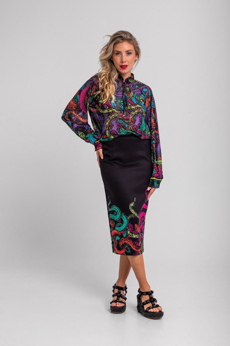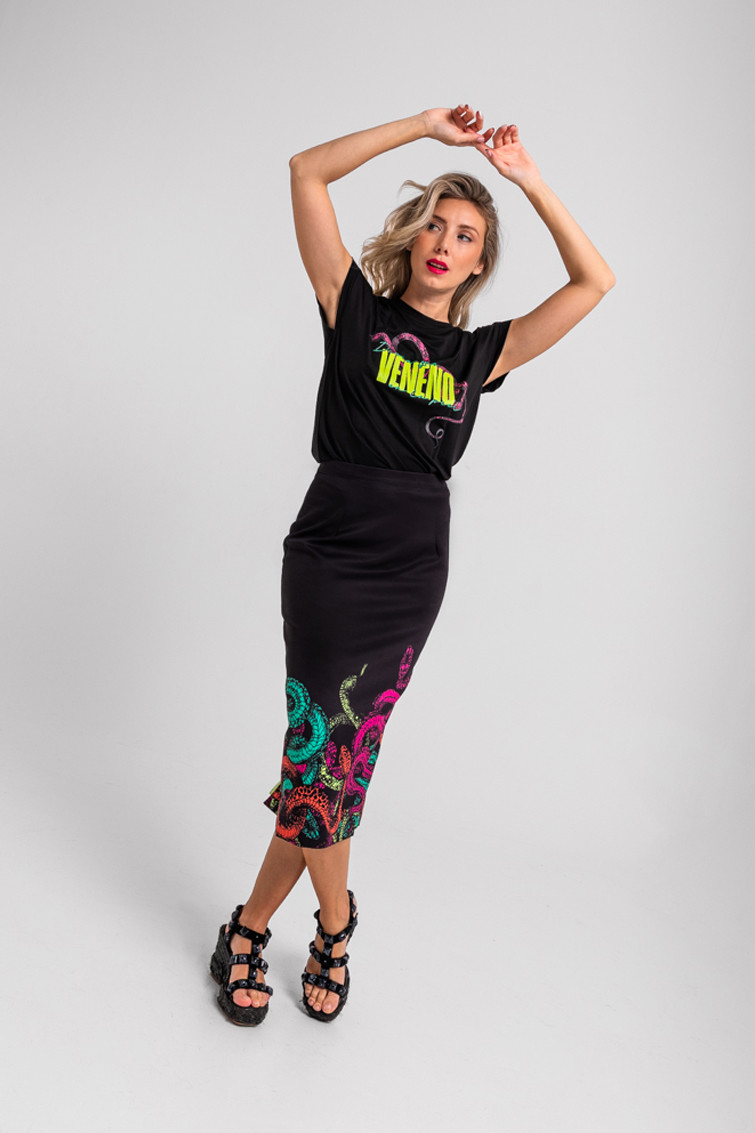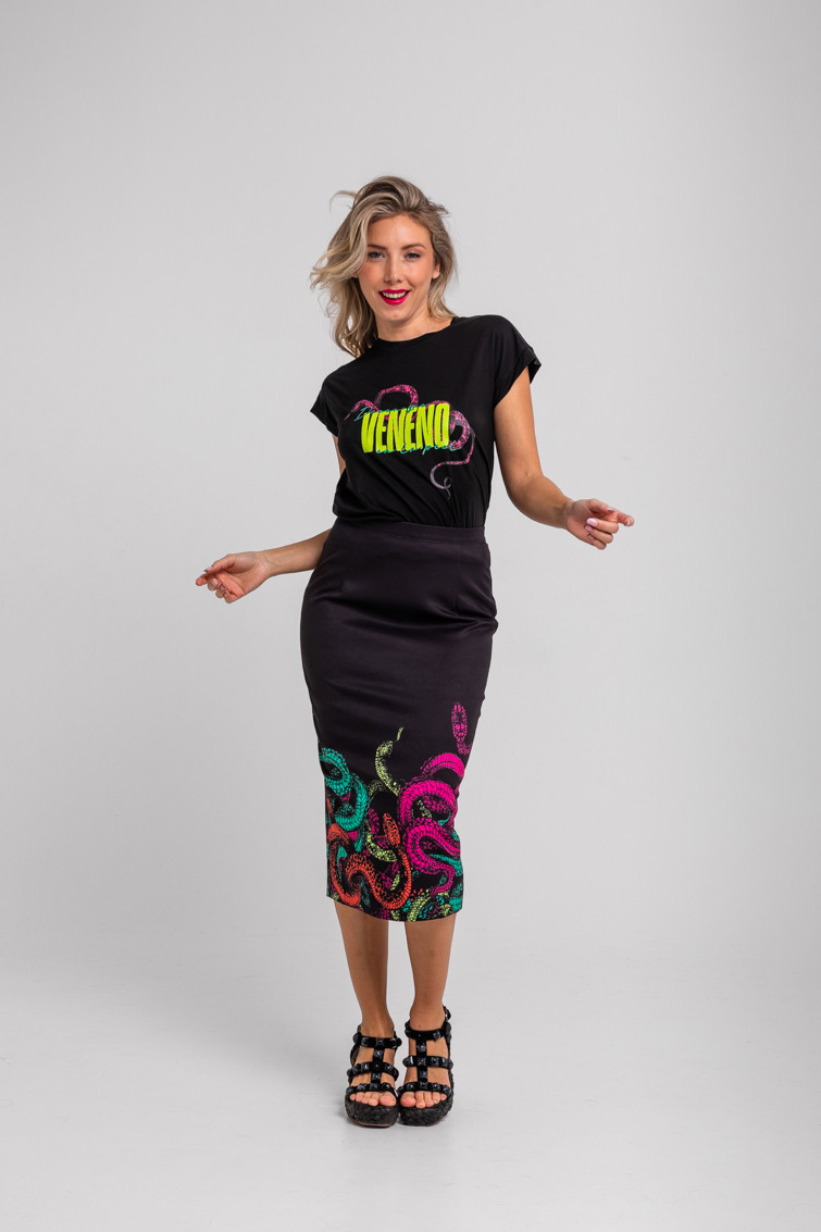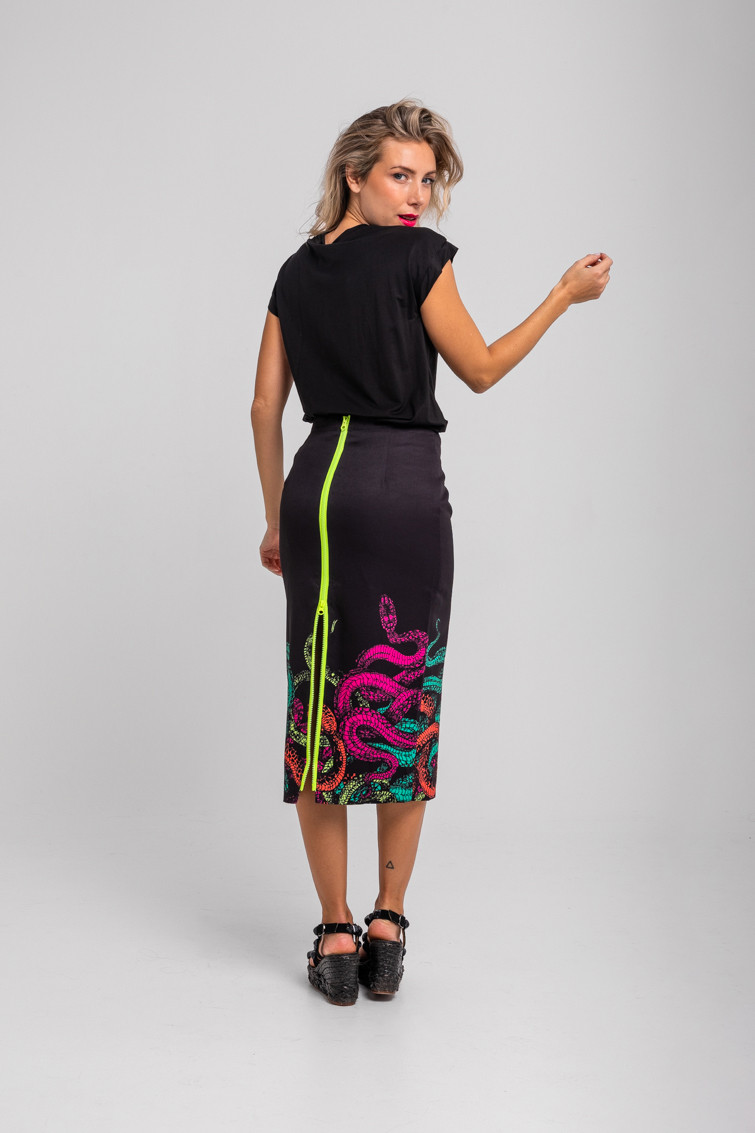Veneno: dicen que tengo veneno en la piel – Falda tubo cremallera espalda negro y serpientes: Falda midi con abertura central trasera con cremallera a contraste. – 100% Poliéster. – Lavar a máquina en agua fría. No usar blanqueador. No usar secadora. Secar colgado a la sombra. Planchado a temperatura baja, por debajo de 100 ºC. Planchar del revés. No dejar la plancha parada sobre la prenda. Lavar con colores similares. – TALLA XS: Medidas de cintura 35 cm, cadera 45 cm y largo 76,5 cm. TALLA S: Medidas de cintura 37 cm, cadera 47 cm y largo 78 cm. TALLA M: Medidas de cintura 39 cm, cadera 49 cm y largo 79,5 cm. TALLA L: Medidas de cintura 41 cm, cadera 51 cm y largo 81 cm. TALLA XL: Medidas de cintura 43 cm, cadera 53 cm y largo 82,5 cm. – Las medidas de las prendas pueden presentar pequeñas variaciones debido al proceso de producción de hasta 2 cm. – Lolina ha realizado un gran esfuerzo para mostrar los colores de las prendas de la forma más cercana a la realidad posible. No obstante, queremos que tengas en cuenta que el color de las prendas que aparecen en pantalla puede estar sujeto a variaciones dependiendo de la calidad de tu ordenador o smartphone.