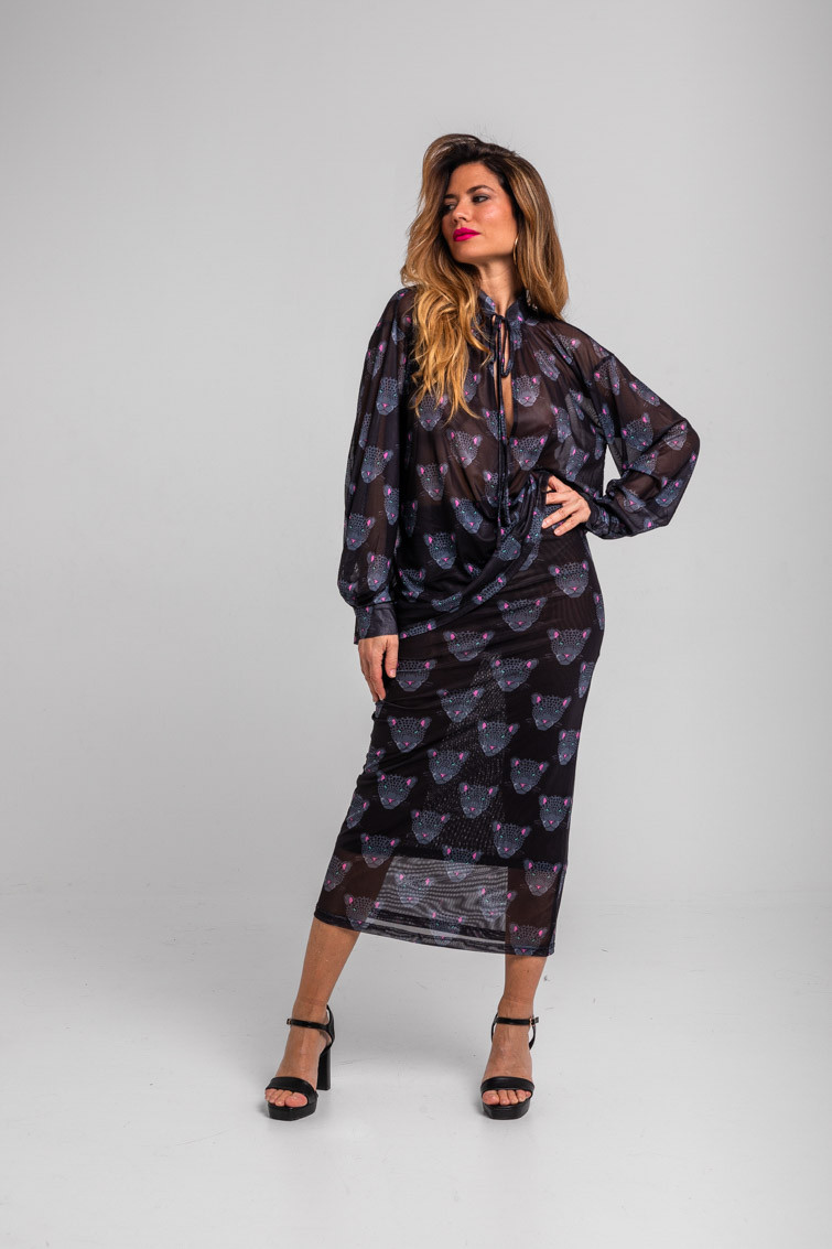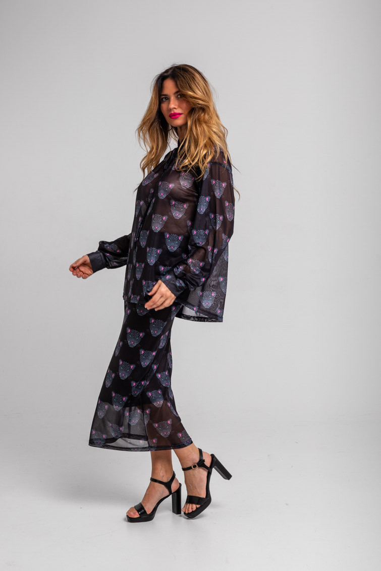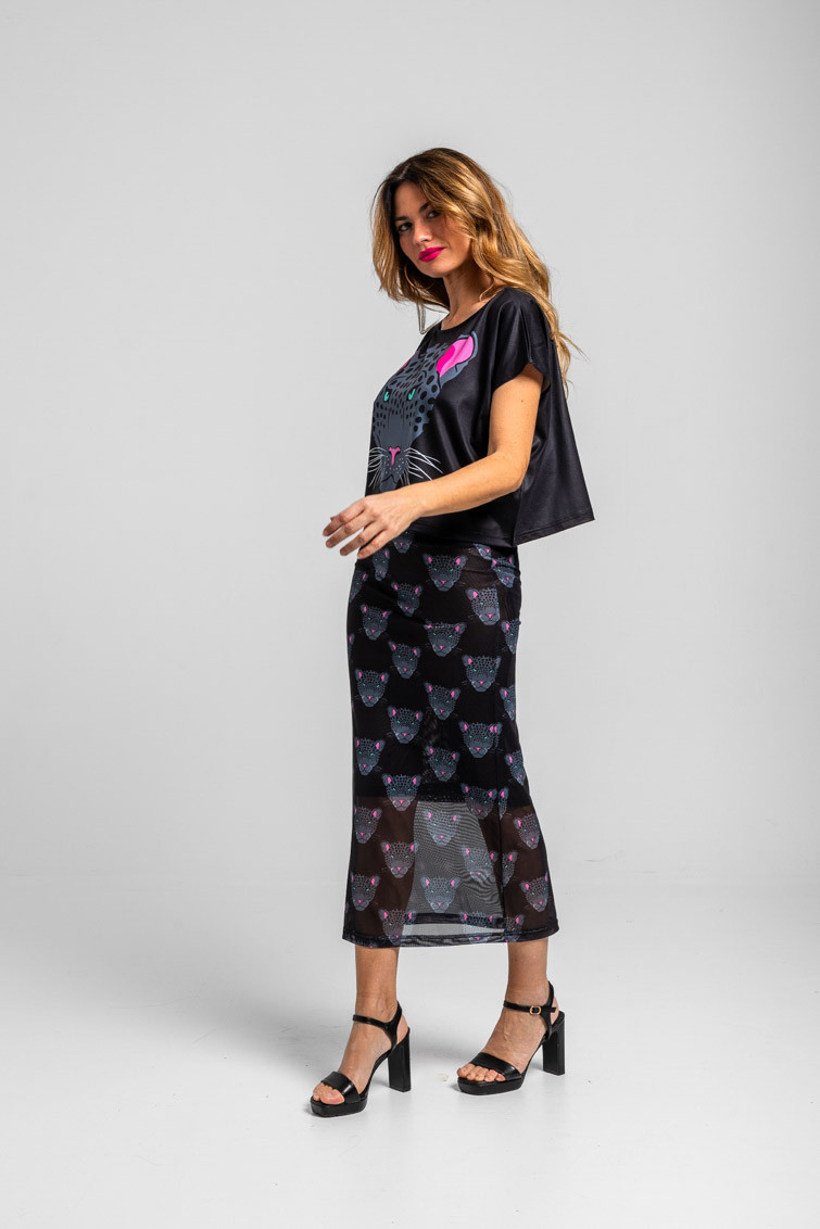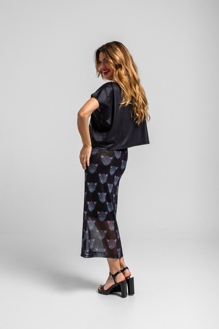 Nocturna: y siembre al acecho intentando cazar al tiempo – Falda tul ajustada negra con panteras: Falda midi de tejido elástico. Modelo ajustado, con estampado vectorial. – 95% Poliéster y 5% Elastán. – Lavar a máquina en agua fría. No usar blanqueador. No usar secadora. Secar colgado a la sombra. Planchado a temperatura baja, por debajo de 100 ºC. Planchar del revés. No dejar la plancha parada sobre la prenda. Lavar con colores similares. – TALLA XS: Medida de la cintura 30 cm, medida de la cadera 40 cm y largo del cuerpo 83,5 cm.TALLA S: Medida de la cintura 32 cm, medida de la cadera 42 cm y largo del cuerpo 85 cm.TALLA M: Medida de la cintura 34 cm, medida de la cadera 44 cm y largo del cuerpo 86,5 cm.TALLA L: Medida de la cintura 36 cm, medida de la cadera 46 cm y largo del cuerpo 88 cm.TALLA XL: Medida de la cintura 38 cm, medida de la cadera 48 cm y largo del cuerpo 89,5 cm.TALLA XXL: Medida de la cintura 40 cm, medida de la cadera 50 cm y largo del cuerpo 91 cm. – Las medidas de las prendas pueden presentar pequeñas variaciones debido al proceso de producción de hasta 2 cm. – Lolina ha realizado un gran esfuerzo para mostrar los colores de las prendas de la forma más cercana a la realidad posible. No obstante, queremos que tengas en cuenta que el color de las prendas que aparecen en pantalla puede estar sujeto a variaciones dependiendo de la calidad de tu ordenador o smartphone.