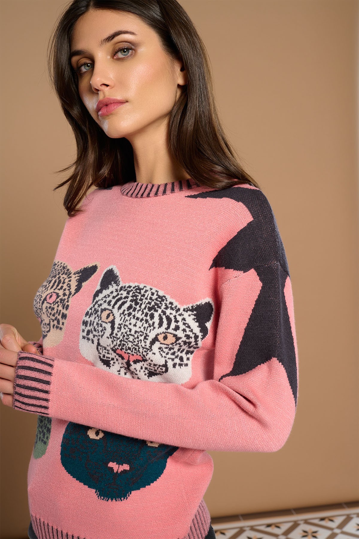 Jersey de punto con cuello redondo y manga larga. Cuello, cintura y mangas en rib. Estampado guepardo.