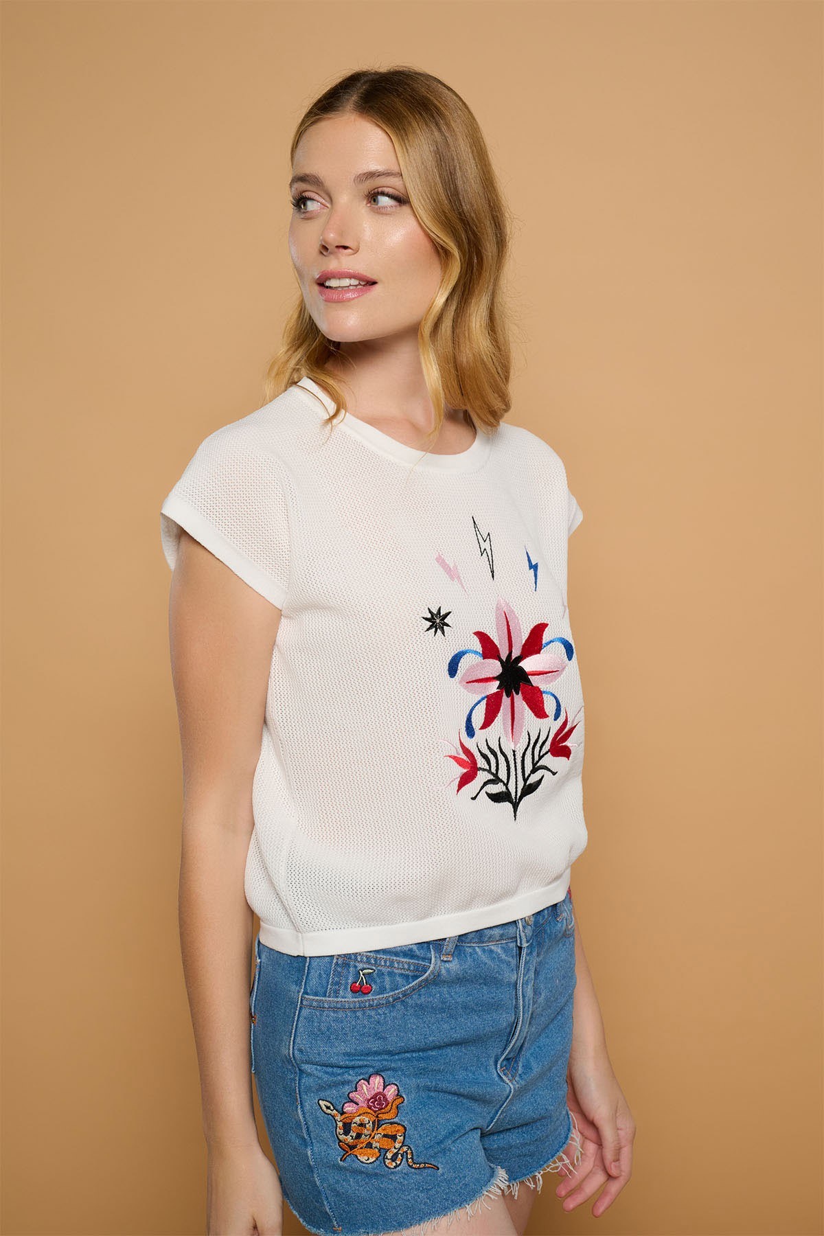 Discover the stunning HIBISCUS SWEATER by Minueto! Prenda icónica de la nueva temporada. This unique piece perfectly encapsulates the retro and colorful style that characterizes the Spanish brand. Make your look the center of attention this season. Ideal for pairing with your favorite accessories. Designed to offer comfort and originality.
