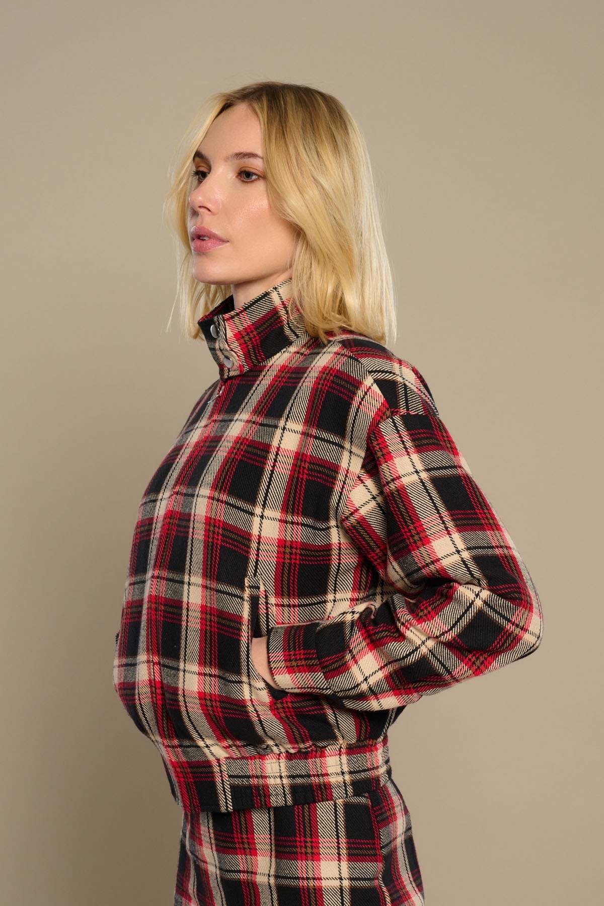 Chaqueta Harrington de cuello solapa y manga larga. Cintura en rib. Cierre con cremallera frontal. Bolsillos laterales. Estampado tartán.