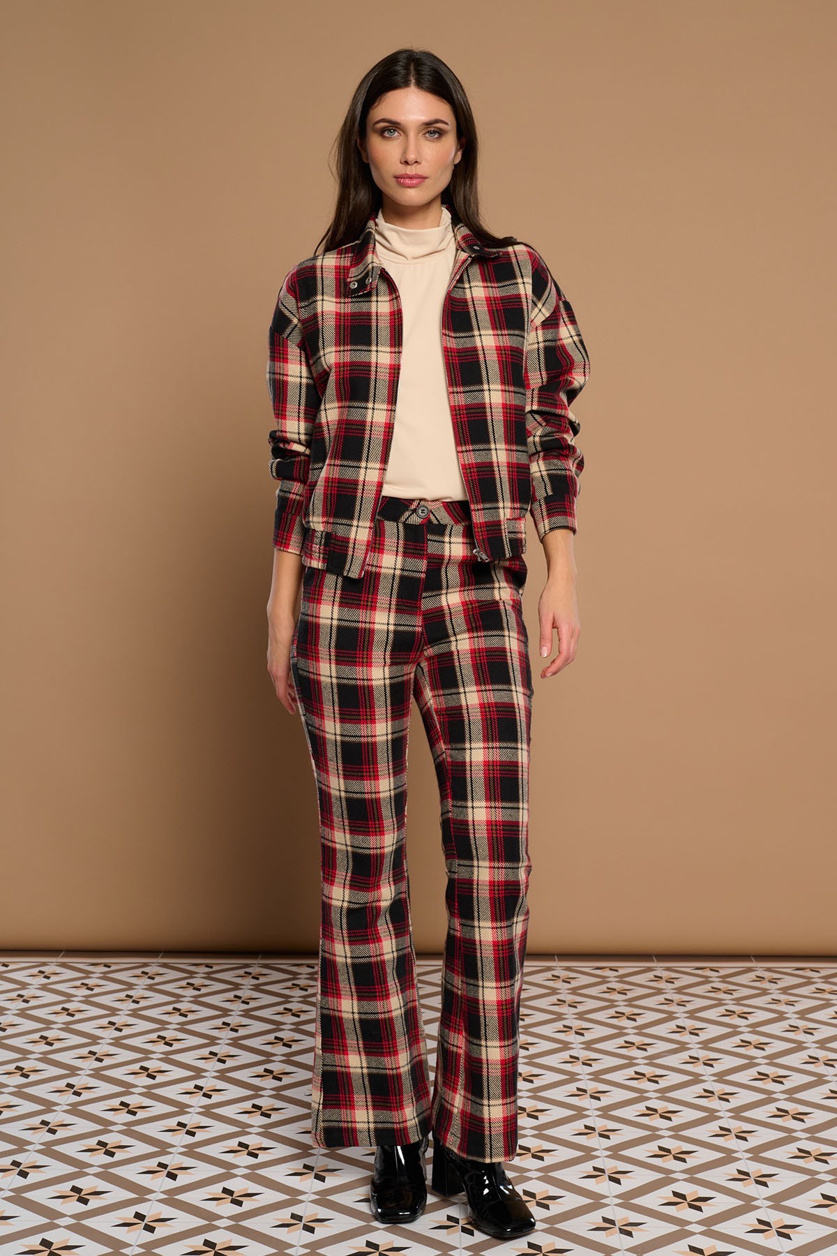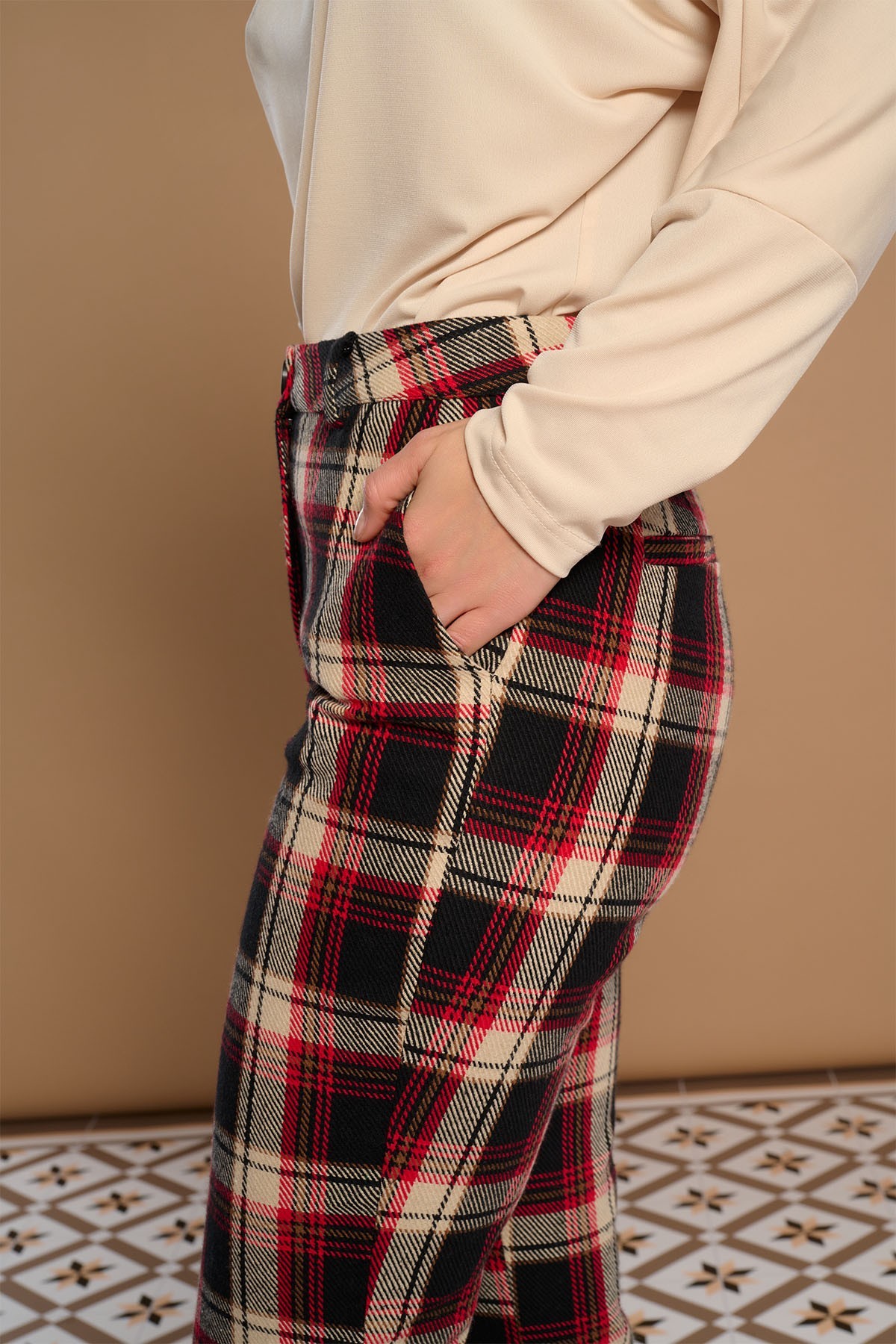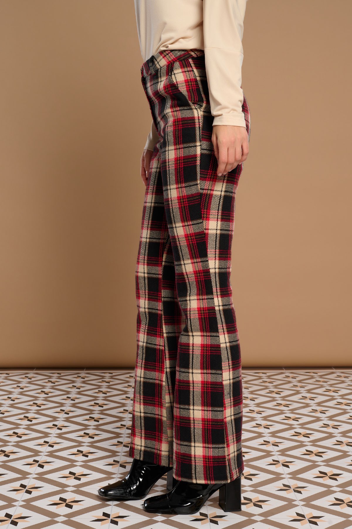 Pantalón de vestir acampanado y de tiro alto. Cierre de botón y cremallera. Estampado tartán. Bolsillos de doble vivo.
