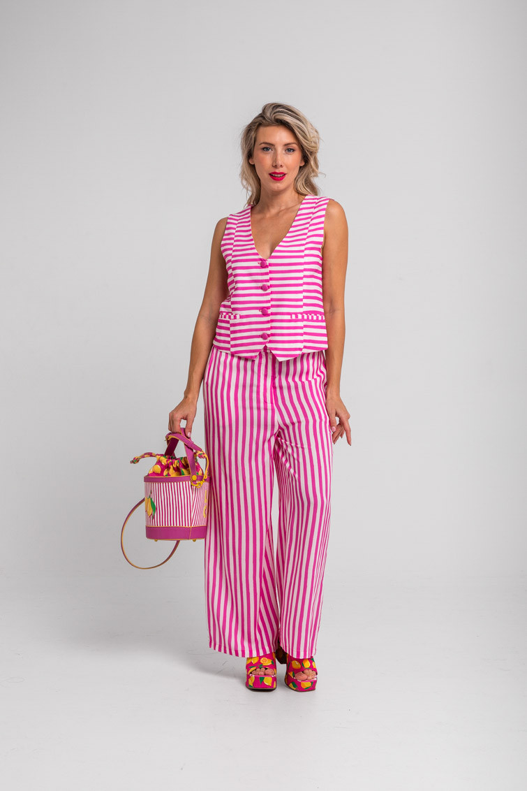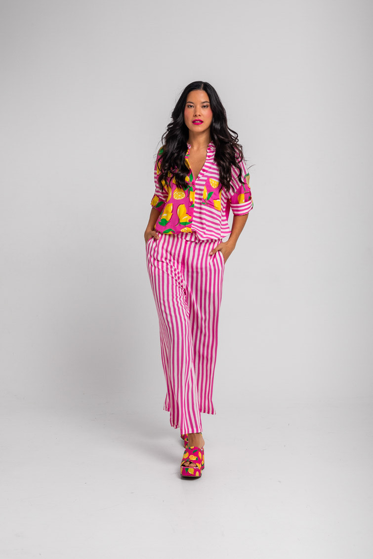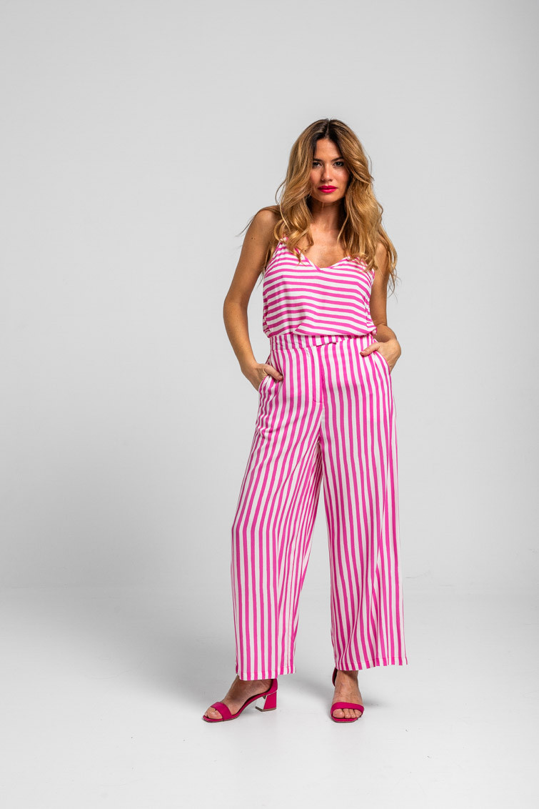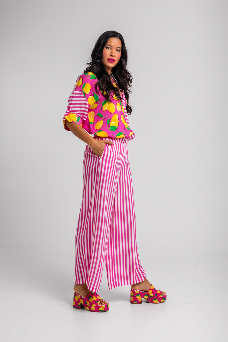 Limoncello: ácido, rico y cargadito – Pantalón culotte de rayas blancas y rosas: Pantalón de tiro alto con bolsillos delanteros, falsos bolsillos en espalda, pernera ancha y cierre frontal con cremallera, botón interior y gancho. – 100% Viscosa. – Lavar a máquina en agua fría en centrifugado corto. No usar blanqueador. No usar secadora. Secar colgado a la sombra. Planchado a temperatura baja, por debajo de 100 ºC. Planchar del revés. No dejar la plancha parada sobre la prenda. Lavar con colores similares. – TALLA XS: Medida de la cintura 32 cm, medida de la cadera 44 cm y largo del cuerpo 96 cm.TALLA S: Medida de la cintura 34 cm, medida de la cadera 46 cm y largo del cuerpo 96 cm.TALLA M: Medida de la cintura 36 cm, medida de la cadera 48 cm y largo del cuerpo 96 cm.TALLA L: Medida de la cintura 38 cm, medida de la cadera 50 cm y largo del cuerpo 96 cm.TALLA XL: Medida de la cintura 40 cm, medida de la cadera 52 cm y largo del cuerpo 96 cm.TALLA XXL: Medida de la cintura 42 cm, medida de la cadera 54 cm y largo del cuerpo 96 cm. – Las medidas de las prendas pueden presentar pequeñas variaciones debido al proceso de producción de hasta 2 cm. – Lolina ha realizado un gran esfuerzo para mostrar los colores de las prendas de la forma más cercana a la realidad posible. No obstante, queremos que tengas en cuenta que el color de las prendas que aparecen en pantalla puede estar sujeto a variaciones dependiendo de la calidad de tu ordenador o smartphone.