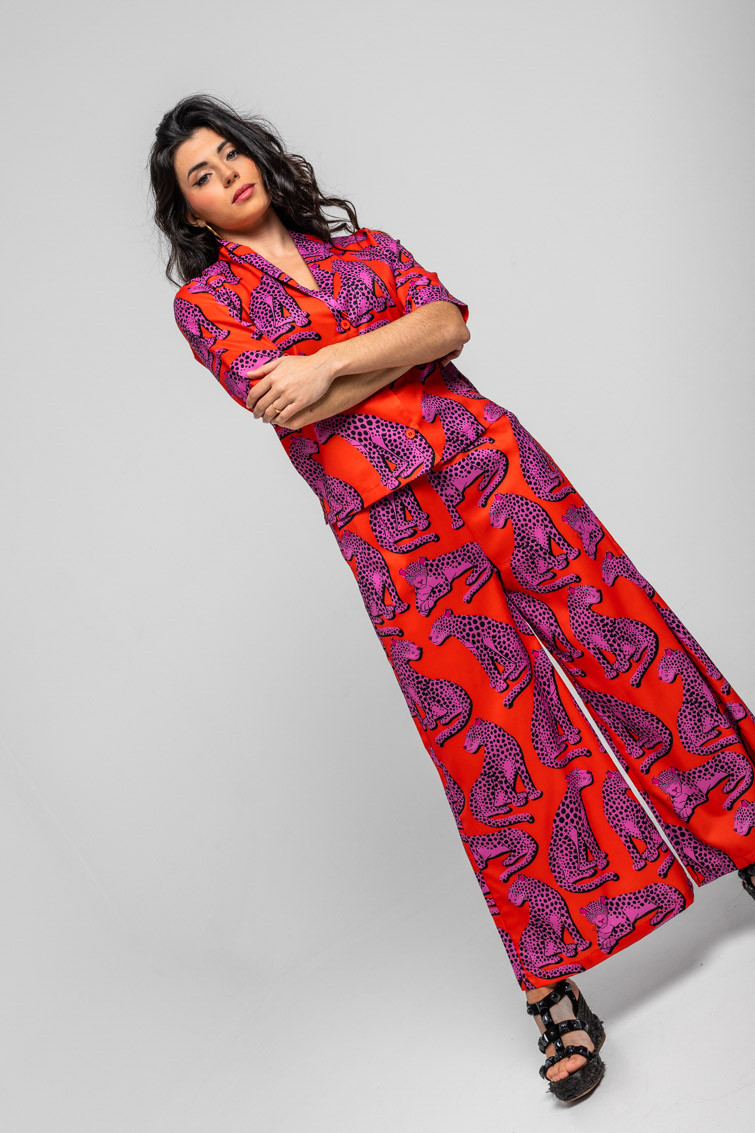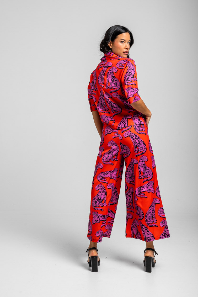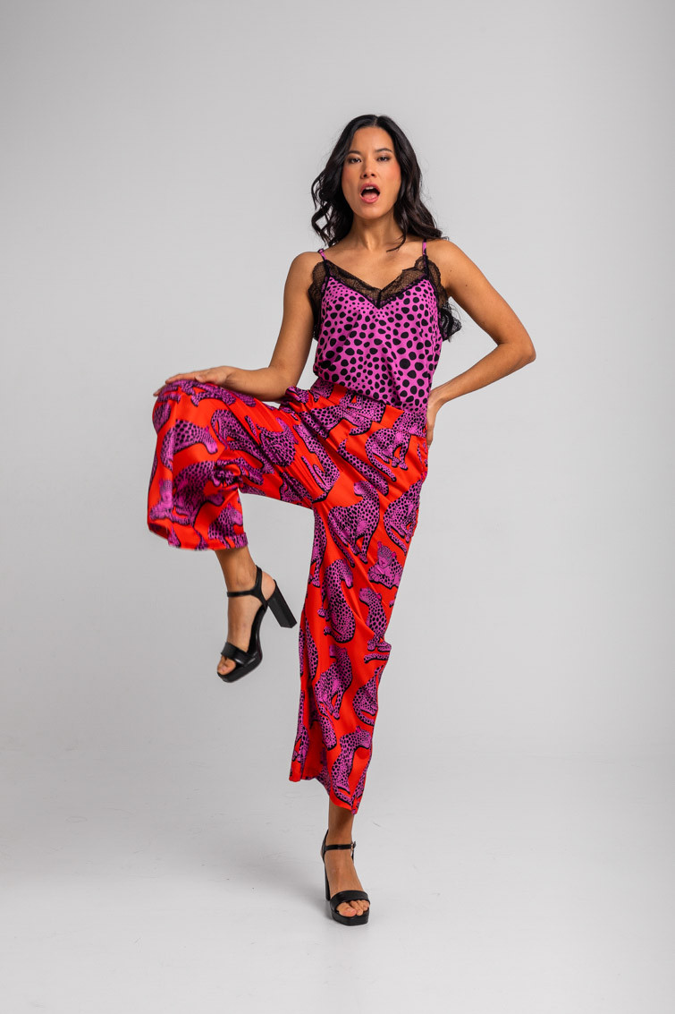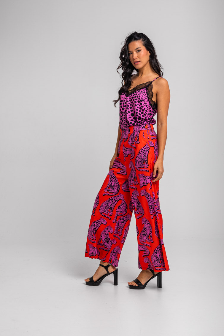 Pantalón fluido naranja y panteras rosas – Pink Panther Lolina