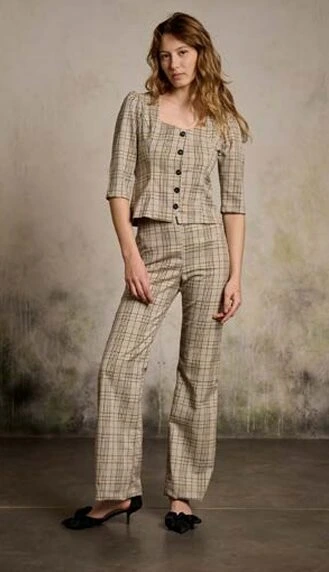 Pantalón de la marca Maggie Sweet cuadros en color beige y camel. Tiro alto. Cremallera lateral. Corte ligeramente acampanado. Composición: 100%PL