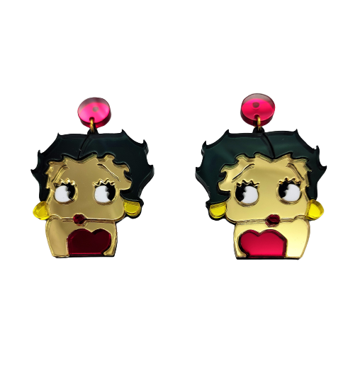 Pendientes en metacrilato con forma de Betty boop elaborados en efecto espejo, son super divertidos y ligeros.