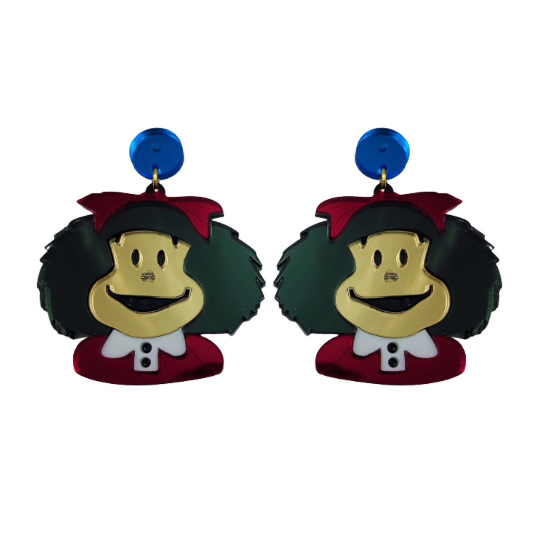 Pendientes en metacrilato con forma de MAFALDA, aquella niña contestataria, rebelde y feminista, que odiaba la sopa y amaba a Los Beatles.