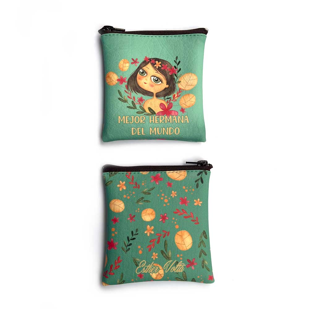 Portamonedas ilustrado por Esther Voltà. Cierre Cremallera. Medidas: 10 cm Ancho x 10 cm Alto Composición: Exterior: Polipiel de alta calidad (Ecopiel o piel vegana) Producto original de Esther Volta. PVP recomendado: 12.00 EUR.