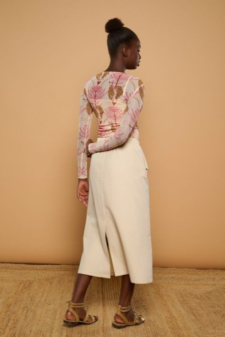 Falda larga de tiro medio. Estilo utilitario. Abertura traseral. Bolsillos laterales. Cintura elástica con lazada.