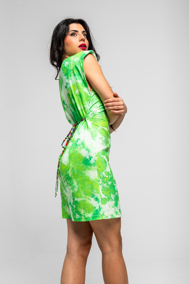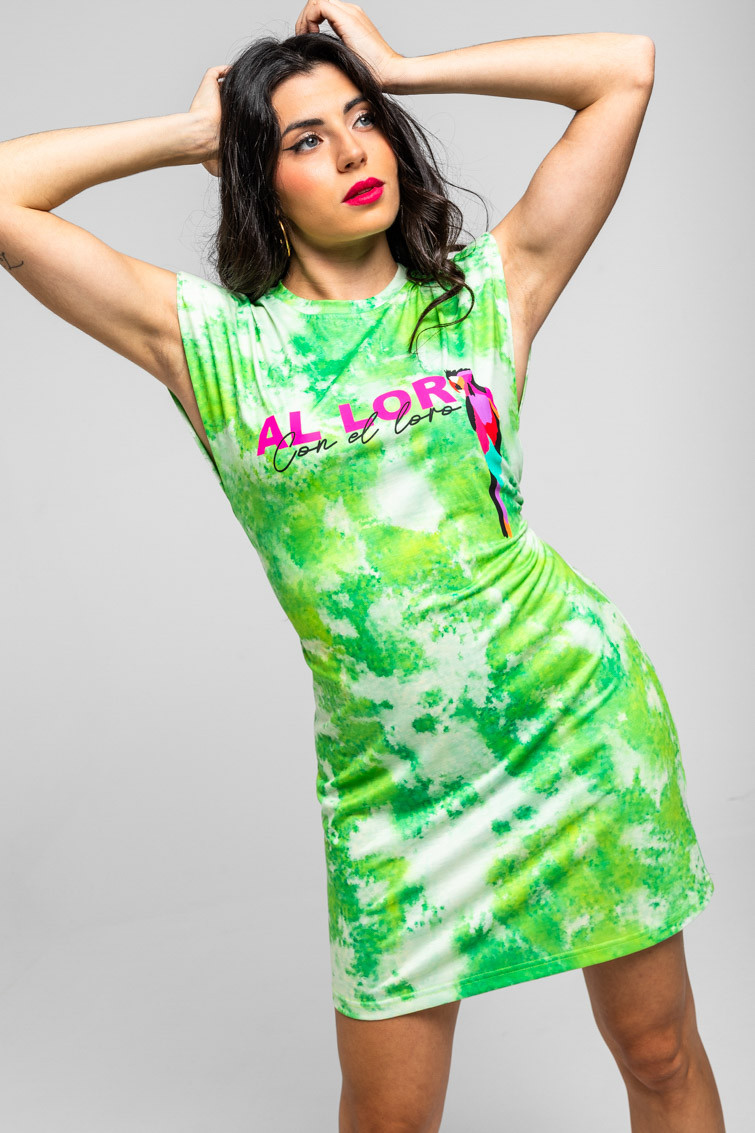 Al Loro: que llega Lolina – Vestido corto sin mangas elástico tie dye con loro: Vestido ajustado corto, con un cinturón trasero. Sin mangas y con hombrera. – 95% Poliéster y 5% Elastán. – Lavar a máquina en agua fría. No usar blanqueador. No usar secadora. Secar colgado a la sombra. Planchado a temperatura baja, por debajo de 100 ºC. Planchar del revés. No dejar la plancha parada sobre la prenda. Lavar con colores similares. – TALLA XS: Medida de pecho 40 cm, medida de la cintura 40 cm, medida de la cadera 43,5 cm y largo del cuerpo 86,5 cm.TALLA S: Medida de pecho 42 cm, medida de la cintura 42 cm, medida de la cadera 45,5 cm y largo del cuerpo 88 cm.TALLA M: Medida de pecho 44 cm, medida de la cintura 44 cm, medida de la cadera 47,5 cm y largo del cuerpo 89,5 cm.TALLA L: Medida de pecho 46 cm, medida de la cintura 46 cm, medida de la cadera 49,5 cm y largo del cuerpo 91 cm.TALLA XL: Medida de pecho 48 cm, medida de la cintura 48 cm, medida de la cadera 51,5 cm y largo del cuerpo 92,5 cm.TALLA XXL: Medida de pecho 50 cm, medida de la cintura 50 cm, medida de la cadera 53,5 cm y largo del cuerpo 94 cm. – Las medidas de las prendas pueden presentar pequeñas variaciones debido al proceso de producción de hasta 2 cm. – Lolina ha realizado un gran esfuerzo para mostrar los colores de las prendas de la forma más cercana a la realidad posible. No obstante, queremos que tengas en cuenta que el color de las prendas que aparecen en pantalla puede estar sujeto a variaciones dependiendo de la calidad de tu ordenador o smartphone.