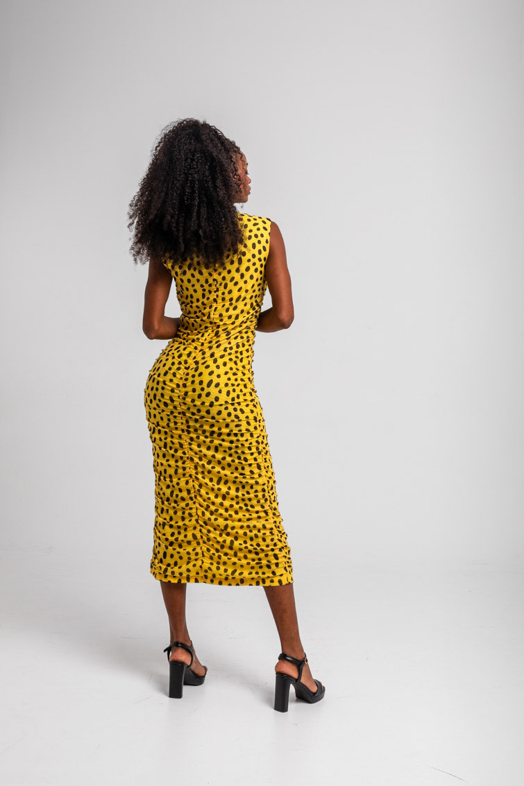 Let’s go to the beach: vamos a la playa oh oh oh!! – Vestido largo drapeado central escote cremallera animal print amarillo y negro: Vestido largo entallado de corte recto, sin mangas y sin cortes laterales. Con fruncido decorativo en el centro delantero desde el escote hasta el bajo, proporcionando textura y ajuste visual. – 95% Poliéster y 5% Elastán. – Lavar a máquina en agua fría. No usar blanqueador. No usar secadora. Secar colgado a la sombra. Planchado a temperatura baja, por debajo de 100 ºC. Planchar del revés. No dejar la plancha parada sobre la prenda. Lavar con colores similares. – TALLA XS: Medida de pecho 35 cm, medida de la cintura 31 cm, medida de la cadera 36 cm y largo del cuerpo 117,5 cm.TALLA S: Medida de pecho 37 cm, medida de la cintura 33 cm, medida de la cadera 38 cm y largo del cuerpo 119 cm.TALLA M: Medida de pecho 39 cm, medida de la cintura 35 cm, medida de la cadera 40 cm y largo del cuerpo 120,5 cm.TALLA L: Medida de pecho 41 cm, medida de la cintura 37 cm, medida de la cadera 42 cm y largo del cuerpo 122 cm.TALLA XL: Medida de pecho 43 cm, medida de la cintura 39 cm, medida de la cadera 44 cm y largo del cuerpo 123,5 cm.TALLA XXL: Medida de pecho 45 cm, medida de la cintura 41 cm, medida de la cadera 46 cm y largo del cuerpo 125 cm. – Las medidas de las prendas pueden presentar pequeñas variaciones debido al proceso de producción de hasta 2 cm. – Lolina ha realizado un gran esfuerzo para mostrar los colores de las prendas de la forma más cercana a la realidad posible. No obstante, queremos que tengas en cuenta que el color de las prendas que aparecen en pantalla puede estar sujeto a variaciones dependiendo de la calidad de tu ordenador o smartphone.