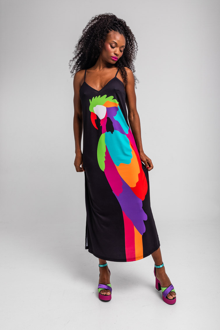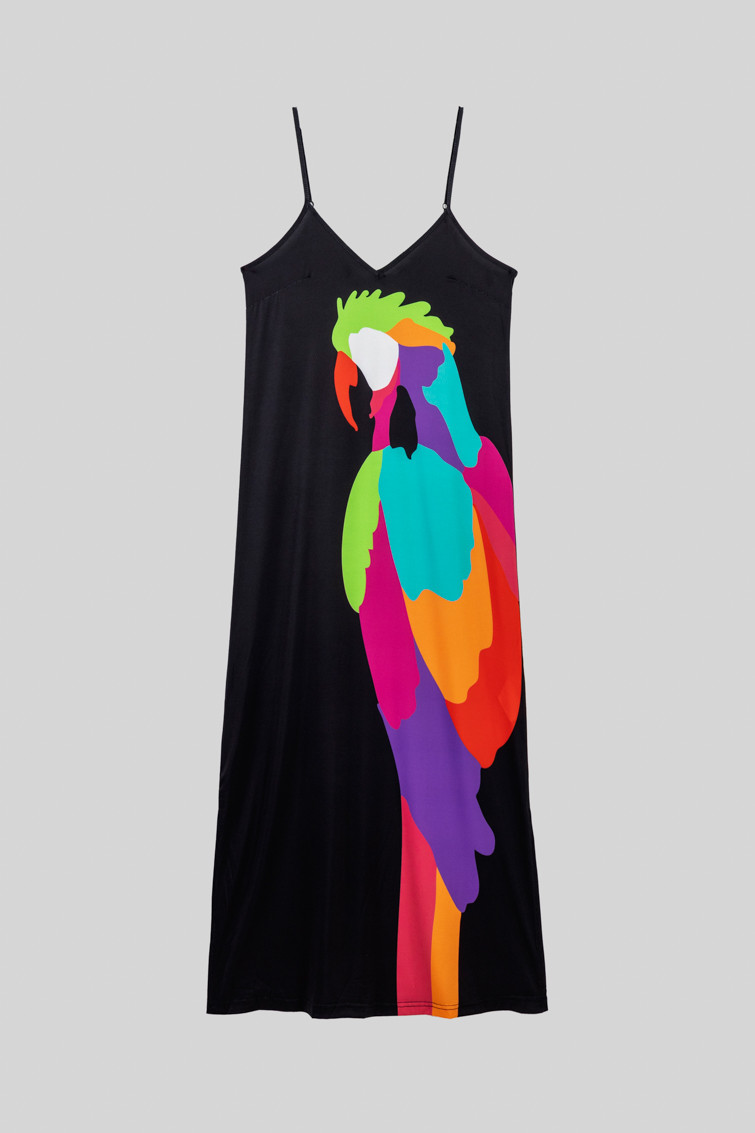 Al Loro: que llega Lolina – Vestido lencero negro con loro multicolor: Vestido lencero midi de tejido fluido de estampado vectorial. Escote pico en pecho y espalda y tirantes finos ajustables. Detalle de aberturas en los laterales. – 95% Poliéster y 5% Elastán. – Lavar a máquina en agua fría. No usar blanqueador. No usar secadora. Secar colgado a la sombra. Planchado a temperatura baja, por debajo de 100 ºC. Planchar del revés. No dejar la plancha parada sobre la prenda. Lavar con colores similares. – TALLA XS: Medida de pecho 42 cm, medida de la cintura 46.5 cm, medida de la cadera 47 cm y largo del cuerpo 106.5 cm.TALLA S: Medida de pecho 44 cm, medida de la cintura 48.5 cm, medida de la cadera 49 cm y largo del cuerpo 108 cm.TALLA M: Medida de pecho 46 cm, medida de la cintura 50.5 cm, medida de la cadera 51 cm y largo del cuerpo 109.5 cm.TALLA L: Medida de pecho 48 cm, medida de la cintura 52.5 cm, medida de la cadera 53 cm y largo del cuerpo 111 cm.TALLA XL: Medida de pecho 50 cm, medida de la cintura 54.5 cm, medida de la cadera 55 cm y largo del cuerpo 112.5 cm. – Las medidas de las prendas pueden presentar pequeñas variaciones debido al proceso de producción de hasta 2 cm. – Lolina ha realizado un gran esfuerzo para mostrar los colores de las prendas de la forma más cercana a la realidad posible. No obstante, queremos que tengas en cuenta que el color de las prendas que aparecen en pantalla puede estar sujeto a variaciones dependiendo de la calidad de tu ordenador o smartphone.