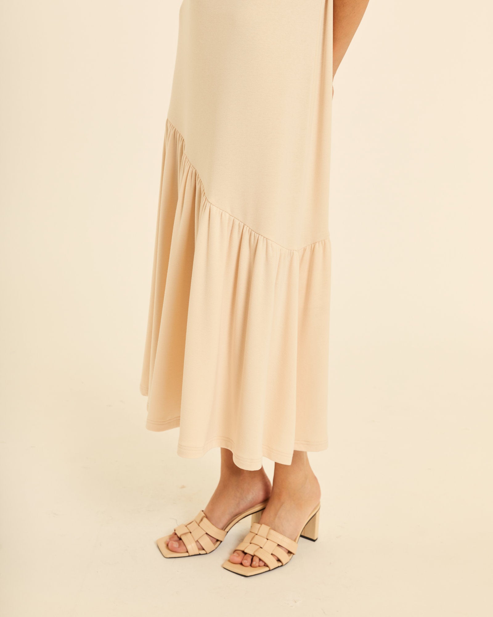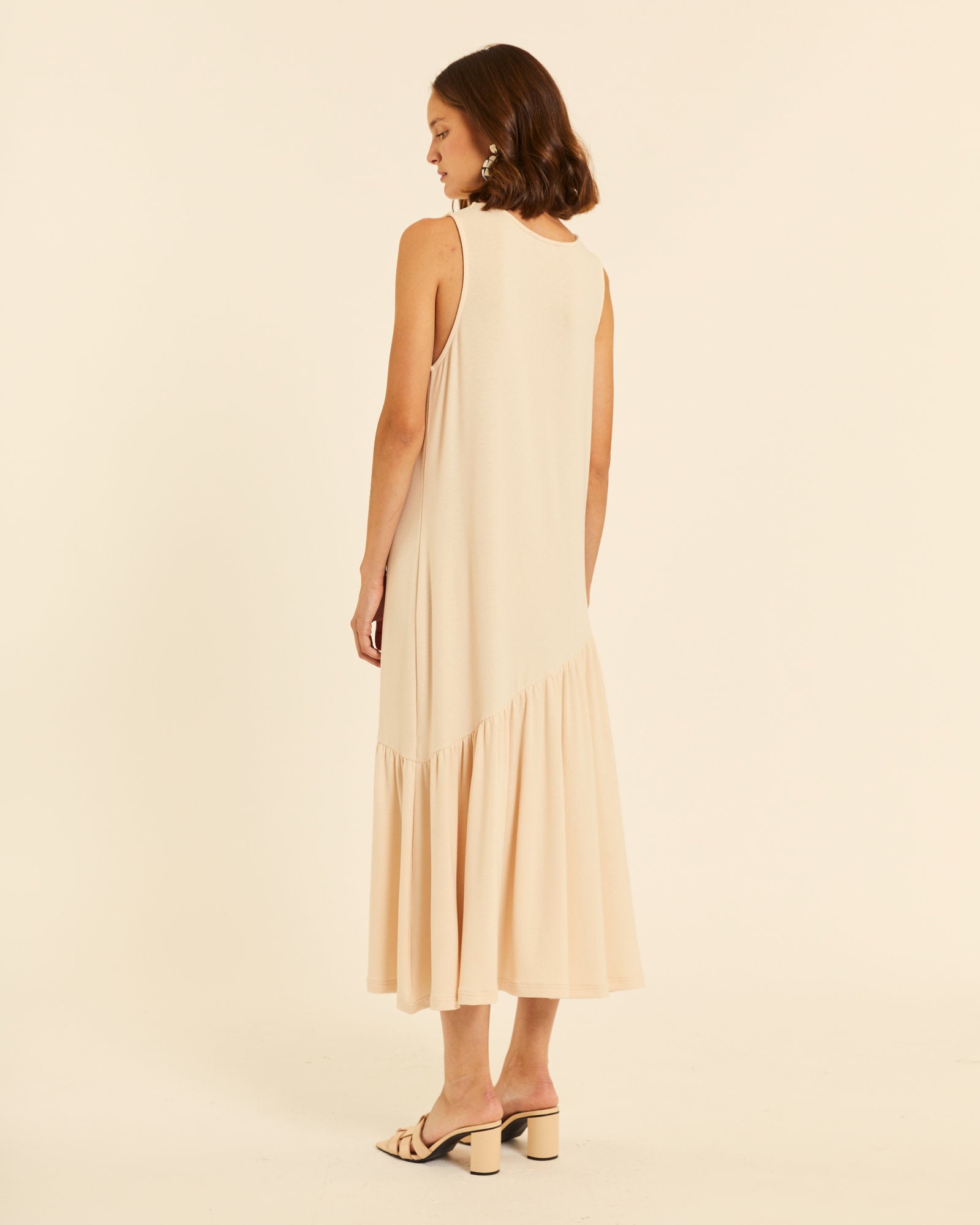 Vestido de mujer crema con estilo elegante y versatil. Ideal para eventos, cenas o invitada, con caida comoda y tallas XS a XL.